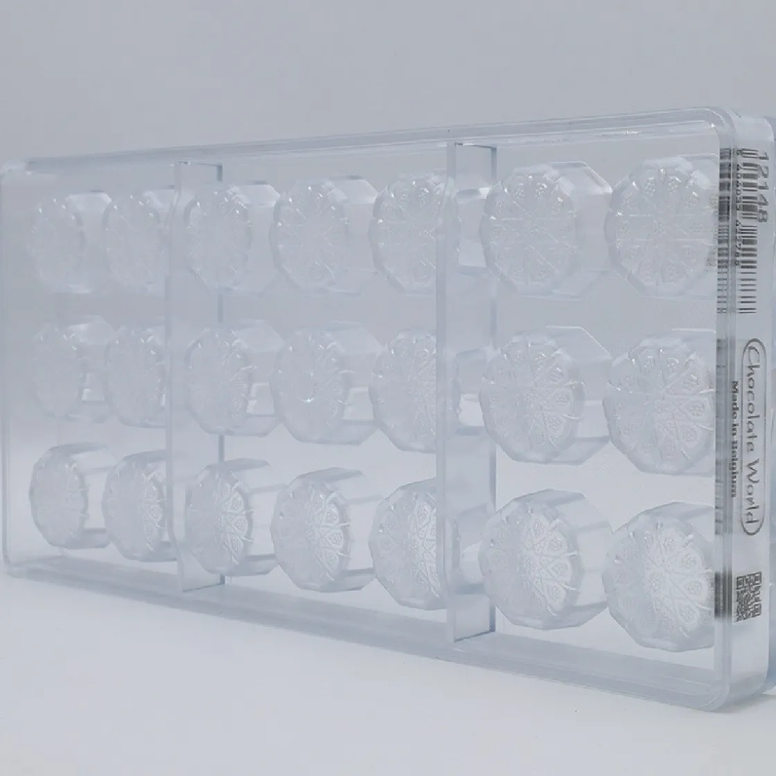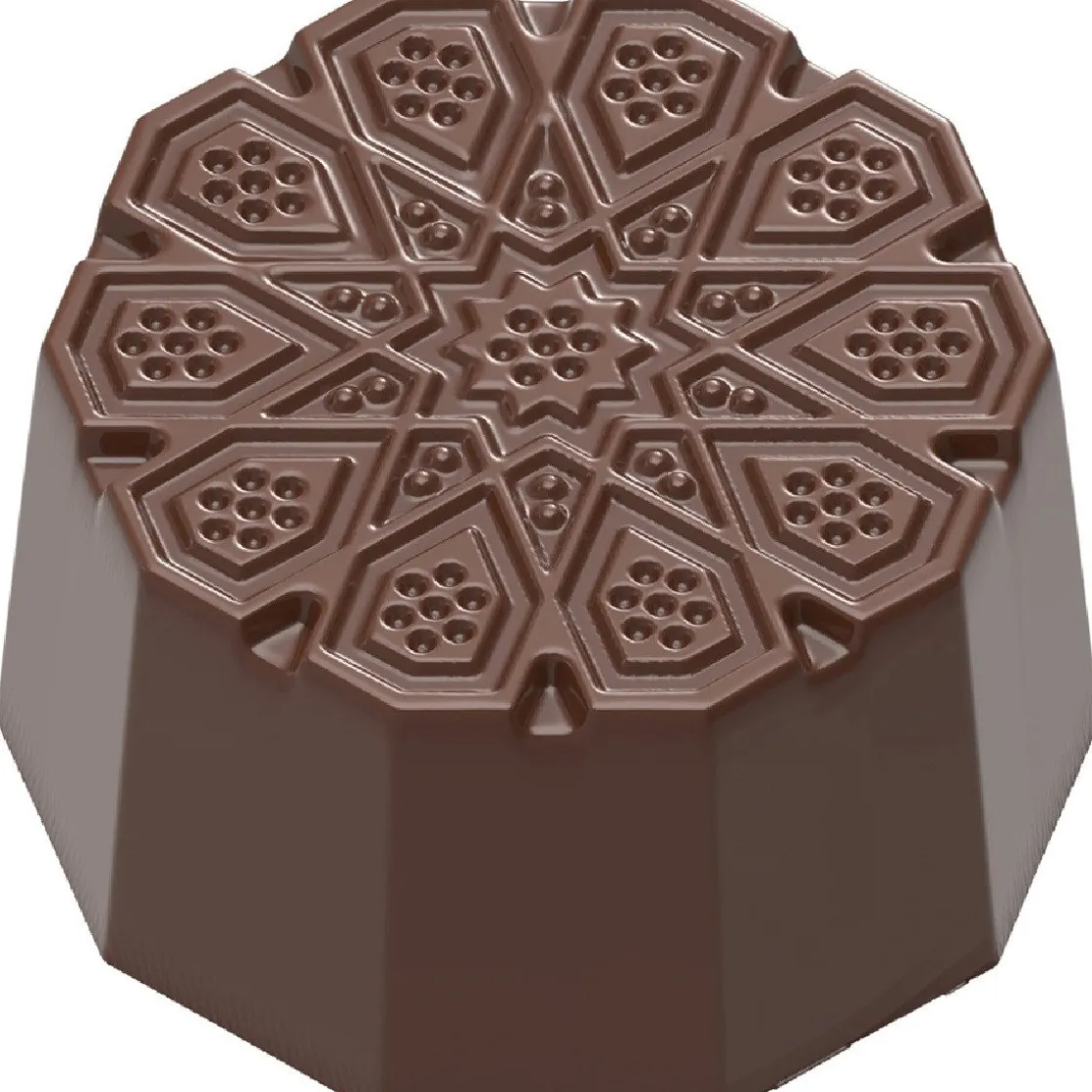 De Bonbonvorm Chocolate World Oosters (21x) 29x30x16mm bevat 21 holtes. Deze holtes hebben een vorm van een tienhoek en zijn gedecoreerd met een Oosterse print. Je creëert hierin moeiteloos verfijnde bonbons met een leuke Oosterse uitstraling. Perfect om luxe bonbons te maken, in een prachtige doosje te doen en deze aan iemand cadeau te geven.