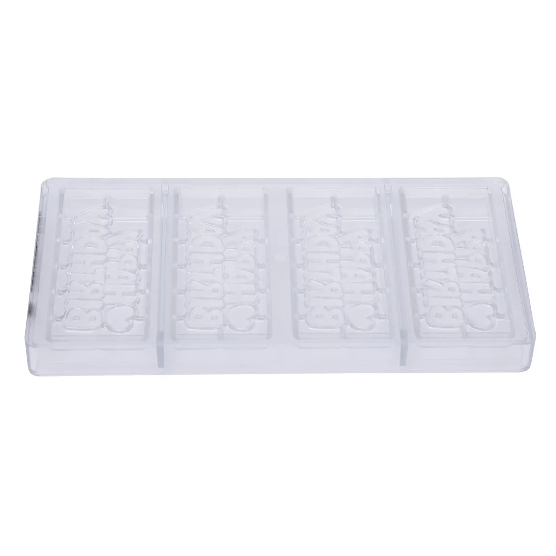 Chocolade vorm van het merk Chocolate World. In totaal kunnen er 4 repen uit deze vorm gehaald worden met de tekst: ‘Happy Birthday’.
