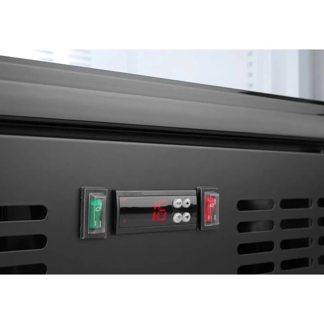 Gepoedercoate zwarte stalen behuizing. Deze uitvoering is vervaardigd uit aluminium met reliëf. Zelfsluitende deuren met dubbellaags glas en een kunststof frame. Voorpaneel van gehard glas. Slot met een sleutel. Statische koeling ondersteund met een ventilator. Automatisch ontdooien. Compressor bevindt zich onder de kamer. Temperatuurbereik: 2-10 °C. Kamer voorzien van LED-verlichting. Elektronisch bedieningspaneel met een digitaal temperatuurdisplay. 4 verstelbare antislipvoeten. Klimaatklasse: 4.