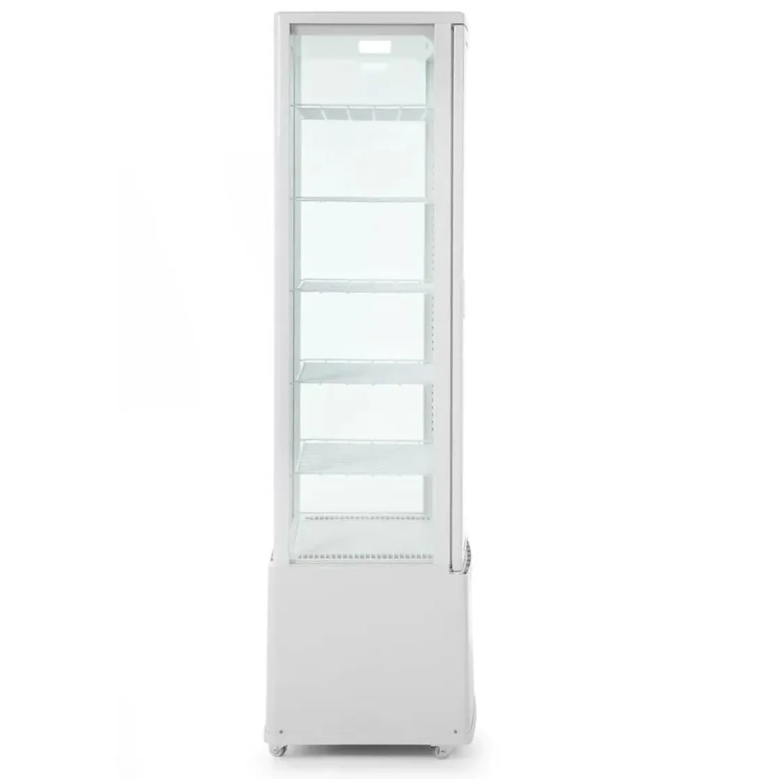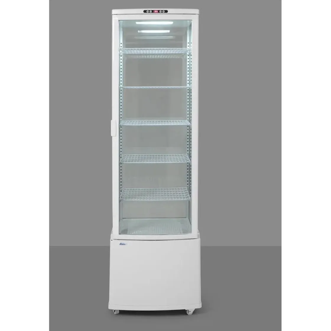 Deze uitvoering is vervaardigd uit ABS en PVC, voorzien van dubbel glas. Koelunit behuizing van ABS. Geforceerde luchtkoeling met automatische ontdooiing, compressor geplaatst onder de koelruimte. Luchtkanaal buiten het glas blaast lucht over het glas om condens te verwijderen en te voorkomen. Duurzame planken met PVC-coating, in hoogte verstelbaar. Met heldere LED-verlichting in het plafond. Digitale temperatuurregelaar en display. Klimaatklasse: 4.