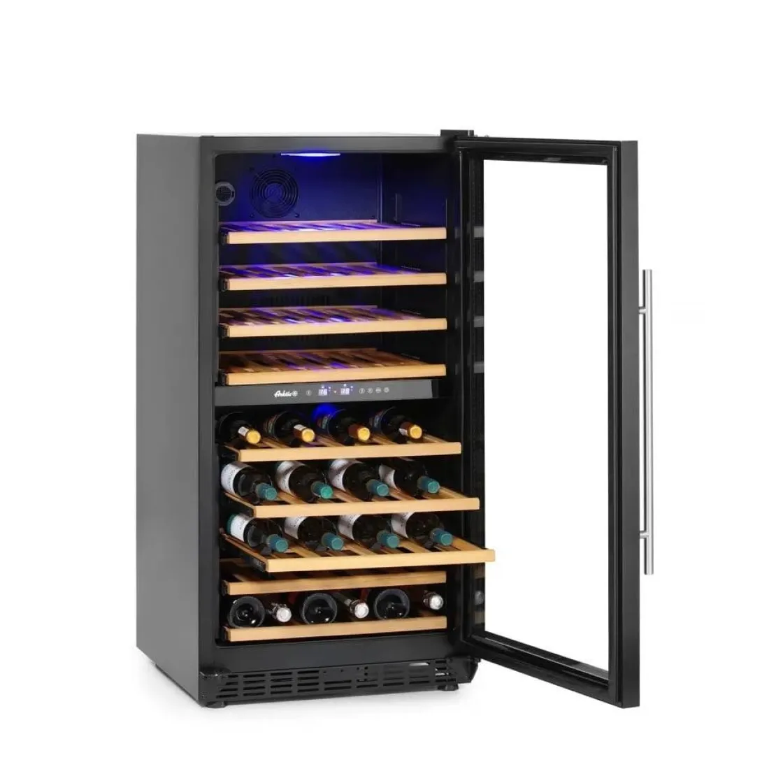 Er kunnen verschillende temperaturen voor de twee zones worden ingesteld. Zwarte poeder gecoate behuizing, randloze gehard glazen deur voorzien van stijlvolle roestvrijstalen handgreep. Geforceerde luchtkoeling met automatische ontdooiing, compressor achter de kamer geplaatst. Met heldere LED-verlichting in de kamer. Digitale temperatuurregelaar en display. Kan worden ingesteld in Celsius of Fahrenheit. Voorzien van 4 verstelbare antislipvoeten. Klimaatklasse: N-ST. Koelmiddel: R600a.