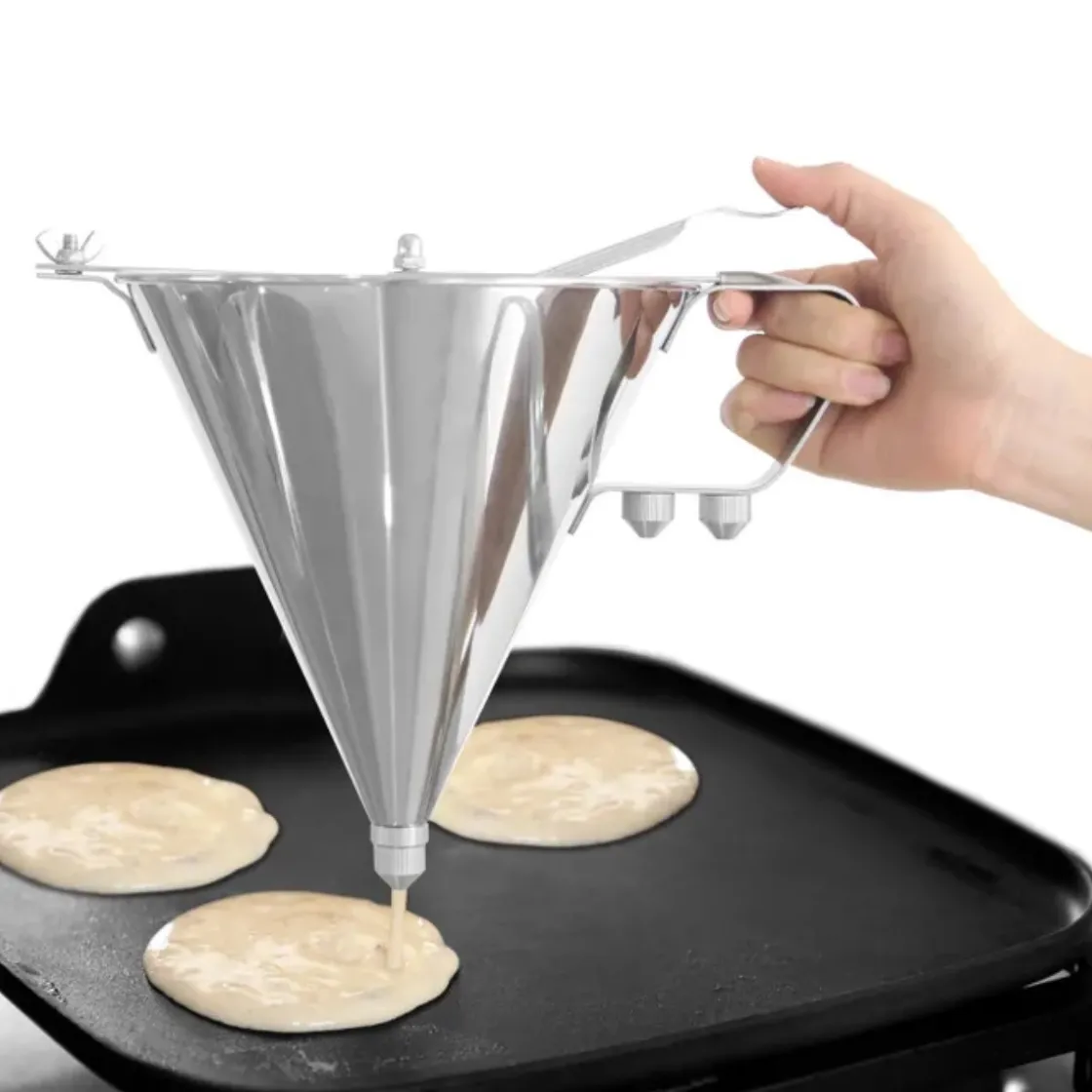 De Hendi beslagdispenser (ook wel Suikergiet Trechter of Fondanttrecht genoemd) 1,5 Liter is multifunctioneel. Je kunt hiermee namelijk diverse voedingsmiddelen verdelen en doseren. Perfect voor het verdelen van poffertjesbeslag, room of fondant. De trechter is ook fijn om sauzen te doseren en voor het decoreren van borden en desserts. Voor het doseren zijn de meegeleverde mondjes handig. In totaal zitten er 3 mondjes in de verpakking met doorsnedes van 4,5 en 6 mm.