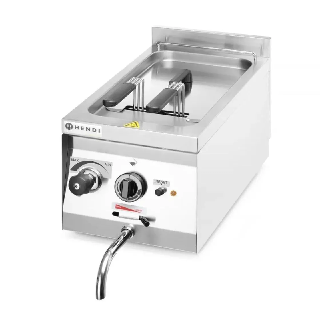 Voor het koken van pasta, dumplings en ook groenten. Deze uitvoering is vervaardigd uit roestvast staal AISI 304. Overige delen van de behuizing (zonder werkblad) van roestvast staal AISI 430. Deze uitvoering is vervaardigd uit roestvast staal AISI 316, met een inhoud van 10 L. Het verwarmingselement bevindt zich aan de onderkant van de container. Directe aansluiting op water. Ventieldraaiknop voor vers water op het bedieningspaneel aan de voorzijde. Temperatuuraanpassing met een draaiknop in het bereik: van 30°C tot 120°C. Indicatielampje informeert over het bereiken van de ingestelde temperatuur. Afneembare uitloop voor gebruikt water. Houder voor manden bedoeld voor het uitlekken van de inhoud. Mechanische vergrendeling om te voorkomen dat de afvoerkraan per ongeluk wordt geopend. Oververhittingsbeveiliging met reset op het bedieningspaneel aan de voorzijde. Antislipvoetjes. Inclusief: 2 manden 100x292x(H)158 mm en een deksel. Het apparaat wordt geleverd zonder stekker.