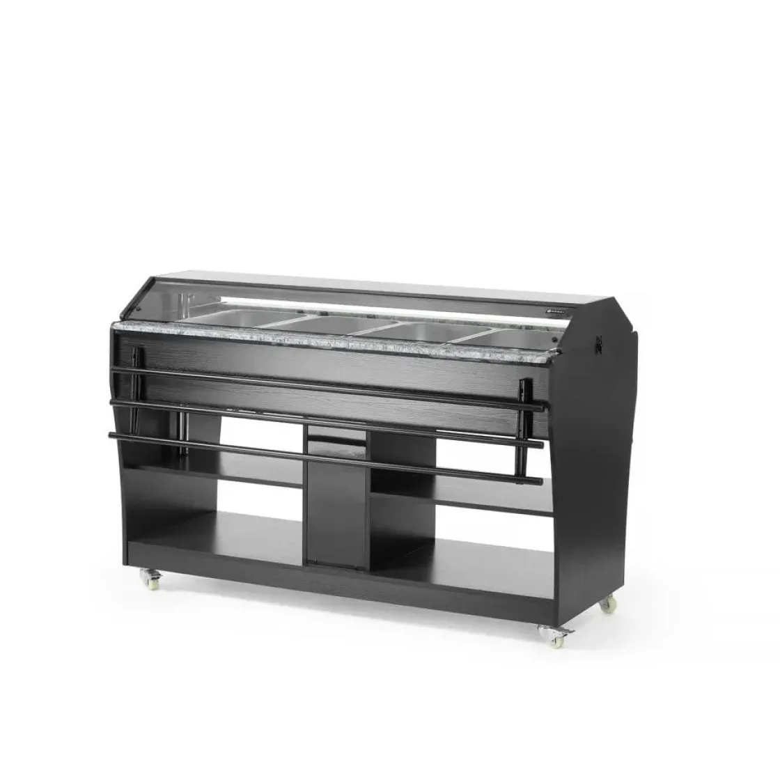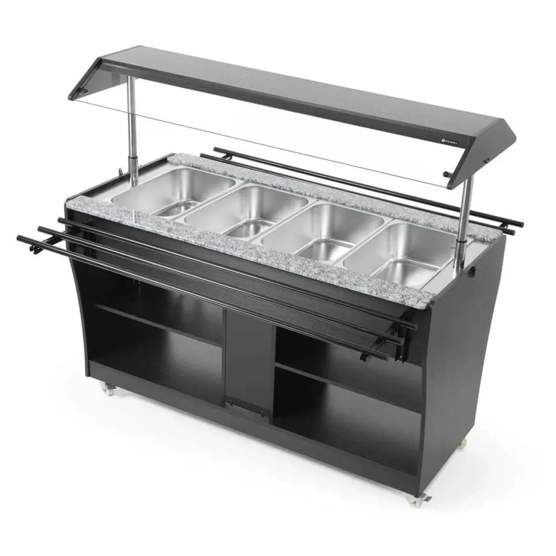 Deze uitvoering is vervaardigd uit roestvast staal met zwart multiplex. Uitermate geschikt om te gebruiken bij 4 GN 1/1 containers – max. 150 mm diep. Geleverd met 4 GN 1/1 containers. Uitgerust met een lampje in de kap. De luifel kan worden neergelaten om als afdekking te fungeren, vastgezet met vergrendelingen. Inklapbare traygeleiders aan beide zijden. 2 planken onder de toonbank. Uitgerust met 4 zwenkwielen. Temperatuur instelbaar van 30°C tot 90°C.