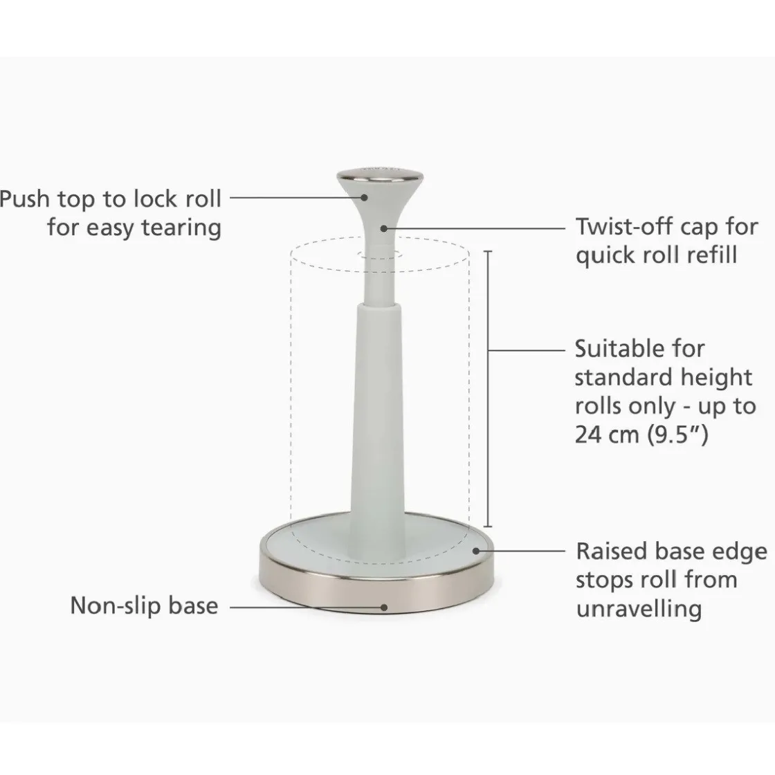 - Geschikt voor standaard rollen tot 24 centimeter