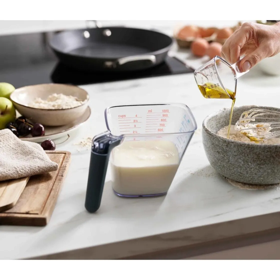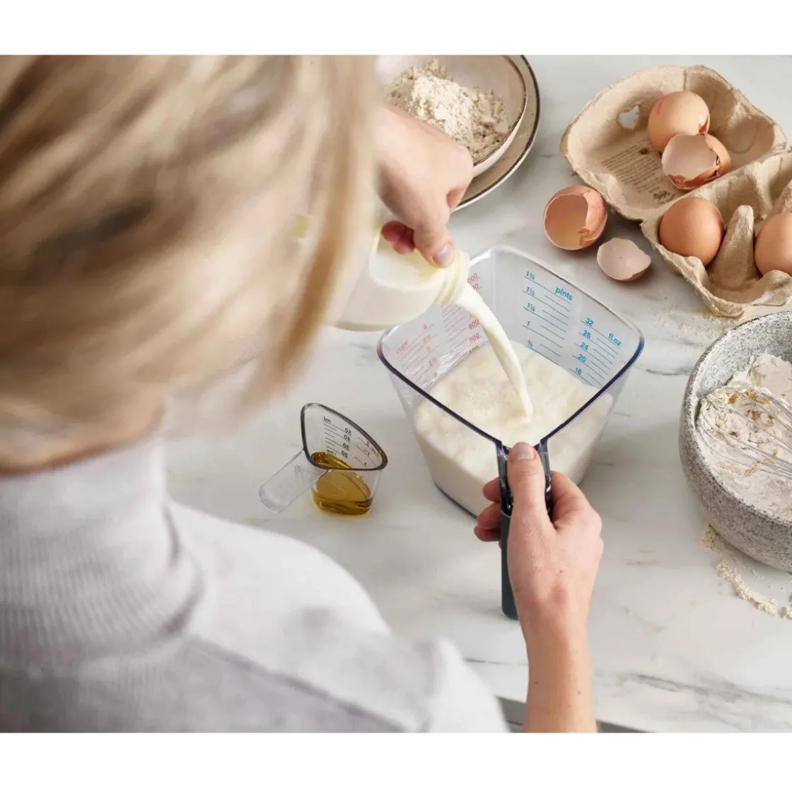 De Joseph Joseph Maatbekers Set/2 bestaat uit een grote maatbeker met een inhoud tot 1 liter en een kleine met een inhoud tot 50 mililiter. Beide zijn beschreven met duidelijke en heldere maateenheden. Let op! Was de set met de hand af, deze zijn namelijk niet vaatwasserbestendig. Door het slimme design kun de bekers ze makkelijk stapelen, waardoor deze erg ruimtebesparend zijn.