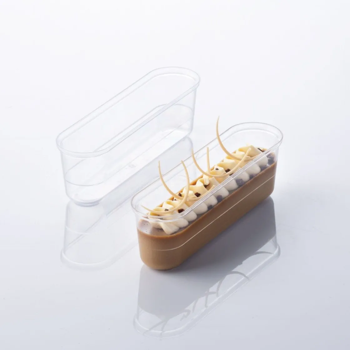 Deze Martellato Lepelgebak cups Eclair (120 ml) / 100 stuks hebben een langwerpige eclairvorm. Ideaal om je creaties op een verfijnde manier te presenteren. Door het transparante materiaal zijn alle lagen en details van je creatie zichtbaar.