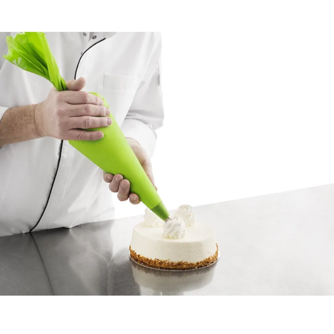 Deze spuitzak heeft een extreem flexibele en gripvaste multilaag-folie, zorgen evroor dat de professional zelfs na het urenlang handeling uitvoeren nog steeds op het scherpst van de snede blijft presteren. De Green Biobased spuitzak staat garant voor efficiëntie in de keuken en een optimale voedsel-veiligheid. Deze spuitzakken voor eenmalig gebruik zijn recht van de rol of uit de doos altijd stevig en schoon, liggen vast in de hand en zijn bovendien handig in gebruik.