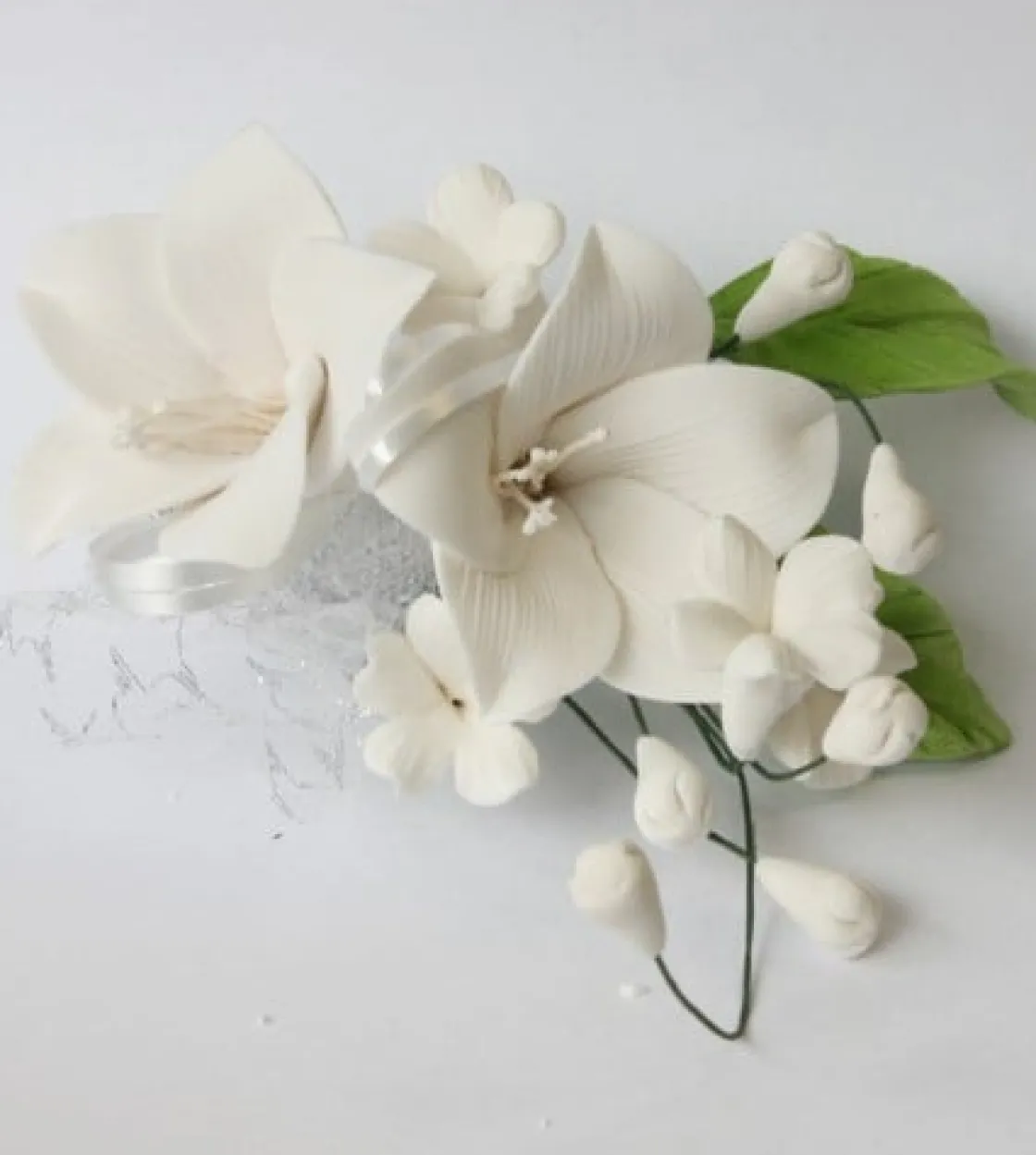 Je kunt ervoor kiezen om zelf een mooie suikerbloem te maken voor op de bruidstaart. Echter vergt dit erg veel tijd en moeite, daarom bieden wij deze kant-en-klare suikerbloem aan. Dit zal zeker de kroon zijn op iedere bruidstaart! Dit fraaie boeket is gemaakt van suikerwerk, echter zitten hier voor de stevigheid enkele ijzerdraden in. Hierdoor blijft de suikerbloem lang zijn vorm behouden. Dit boeket is verkrijgbaar in de kleur wit en zit per 2 stuks verpakt.