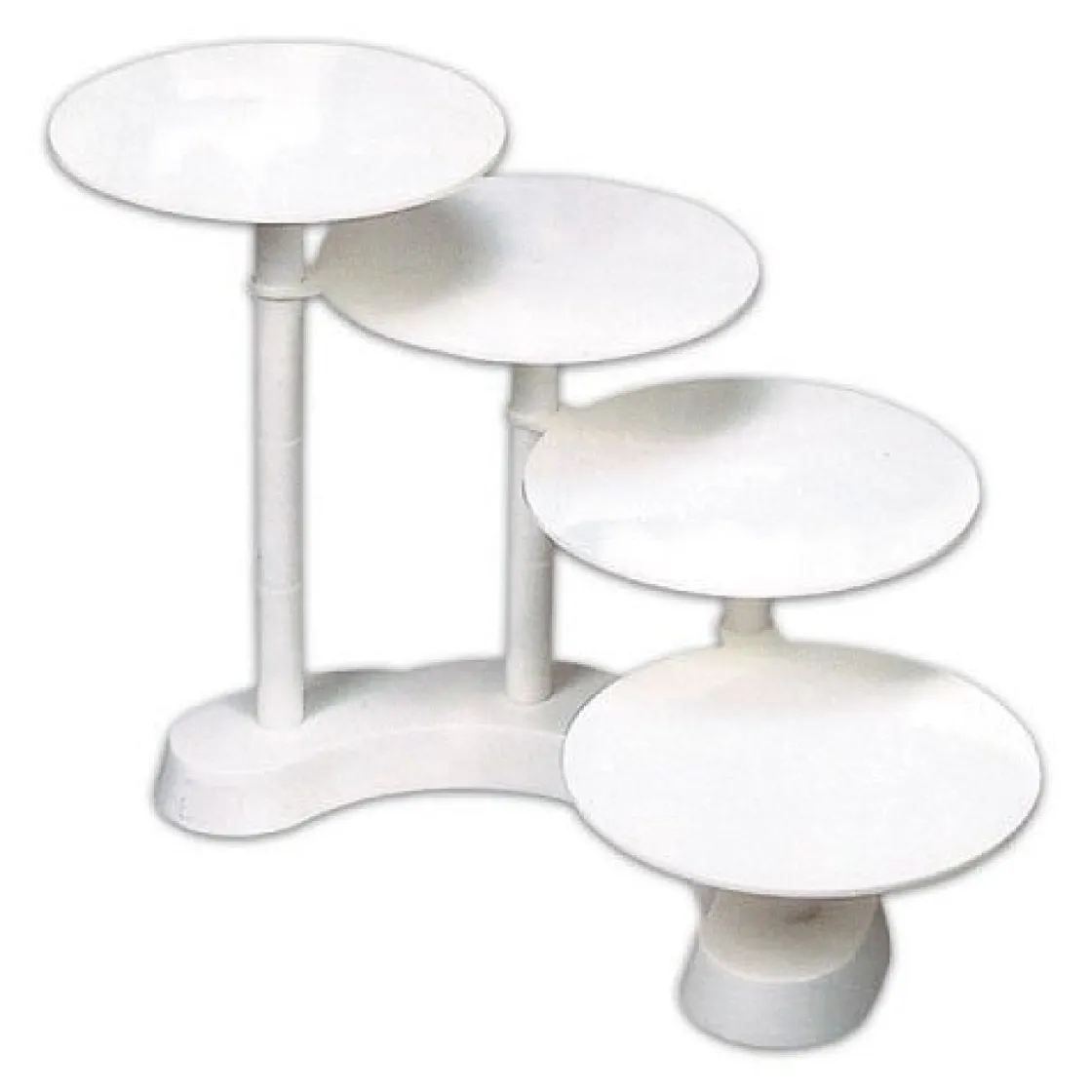 Elegante halfronde taartstandaard voor 4 taarten met een doorsnede van 28cm. Het ondelinge niveauverschil tussen de plateaus is 9,5cm, maar dit kan naar eigen wens worden ingesteld. Deze mooie standaard kan simpel in elkaar worden gezet.