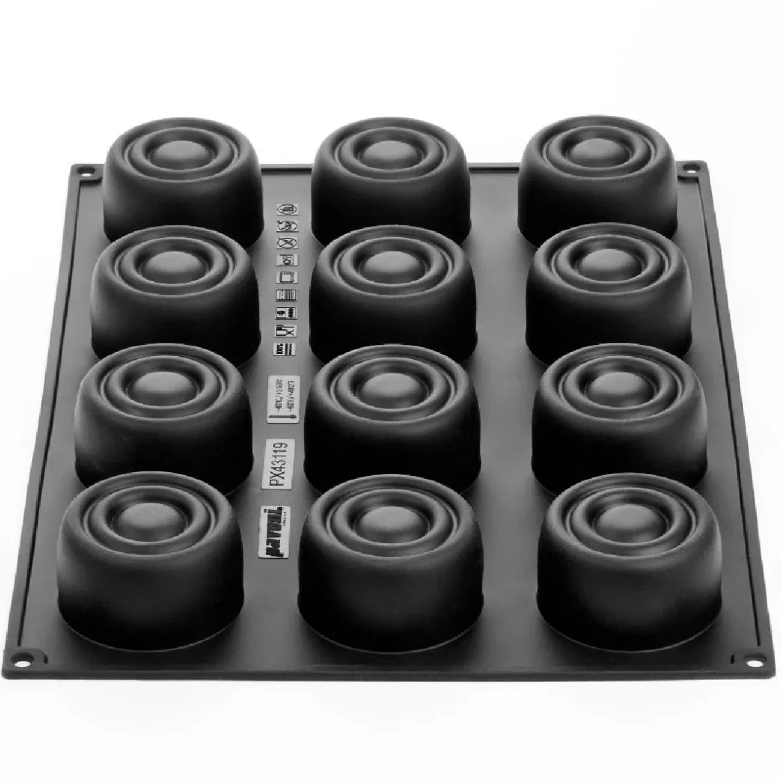 De Pavoni Siliconen Vorm Aura Ø7x4cm (12) 40x30cm bestaat uit 12 holtes met een ronde vorm, afgewerkt met decoratieve cirkelpatronen. Elke holte heeft een diameter van 7 centimeter en een hoogte van 4 centimeter. De vorm is gemaakt van hoogwaardig siliconenmateriaal, waardoor hij flexibel is en bestand tegen zowel lage als hoge temperaturen.