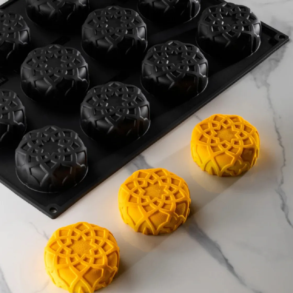 De Pavoni Siliconen Vorm Dahab Ø75x30mm (12) 40×30 cm is een siliconenvorm met een oosters geïnspireerd reliëf. Elke holte vormt een ronde, vlakke creatie met een decoratieve structuur. De patronen zijn tot in detail uitgewerkt en komen perfect naar voren bij het lossen van het product.