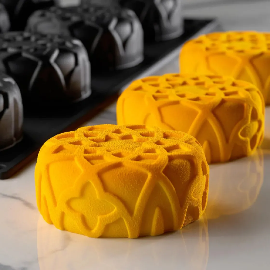Deze vorm is perfect voor het creëren van elegante gebakjes, mousses, semifreddo of ijsgerechten. De reliëfstructuur maakt hem ook geschikt voor velvet sprays of glazuren, waarbij elk detail zichtbaar blijft.