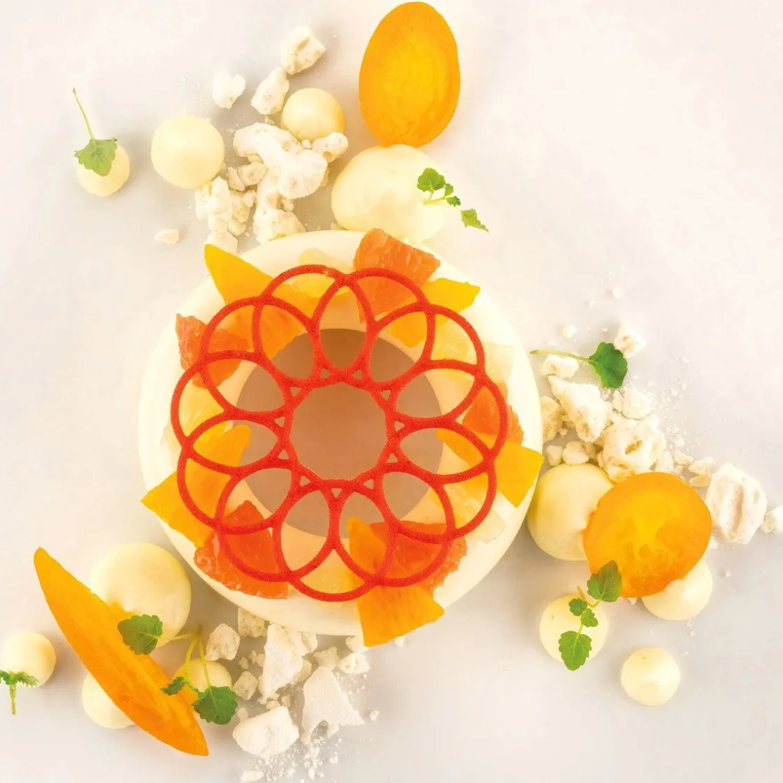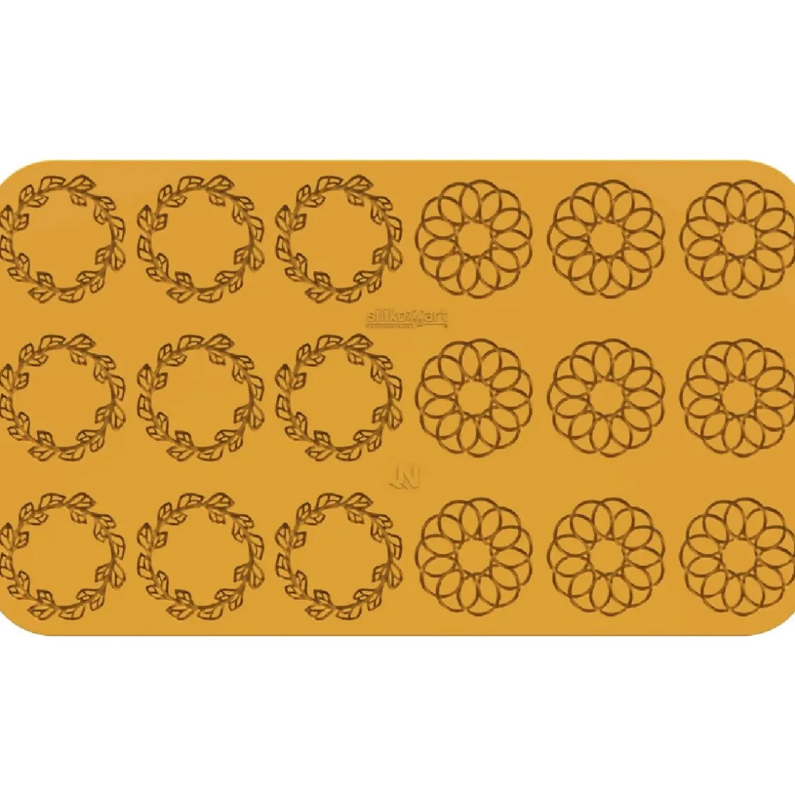 De Silikomart Siliconen Mat Corona (18x) Ø6,8×0,2cm bevat 2 soorten decoraties. Beiden hebben een bloem / kroon vorm. Perfect voor het afwerken van verfijnde en elegante baksels en desserts. De mal is perfect om chocoladedecoraties te maken of versiersels van pâte à cigarette.