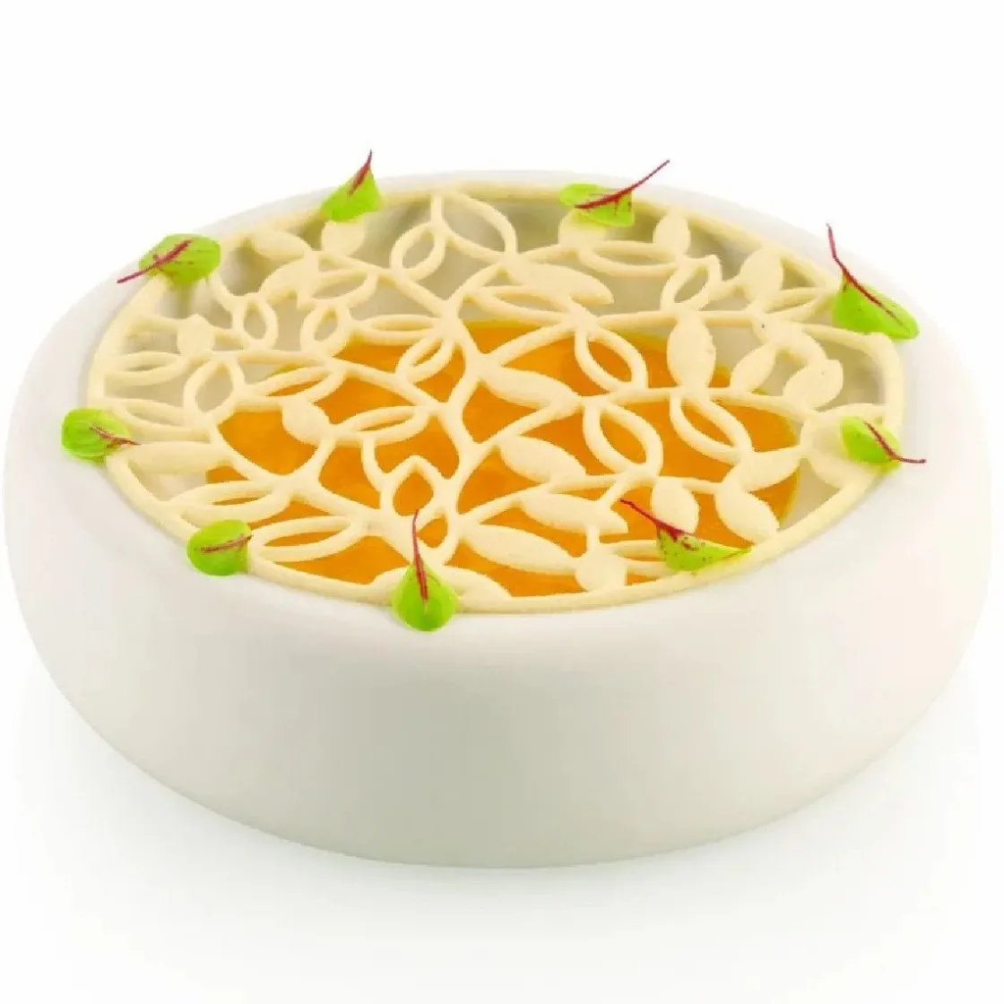 De Silikomart siliconen mat Esotico (2) Ø140×2 mm is een verfijnde decoratiemat waarmee je elegante bladerpatronen creëert in bijvoorbeeld chocolade, isomalt of krokante massa’s. De mat bevat twee ronde vormen met een diameter van 14 centimeter. Ideaal voor het maken van strakke, gedetailleerde schijven als finishing touch op taarten, gebak of desserts.