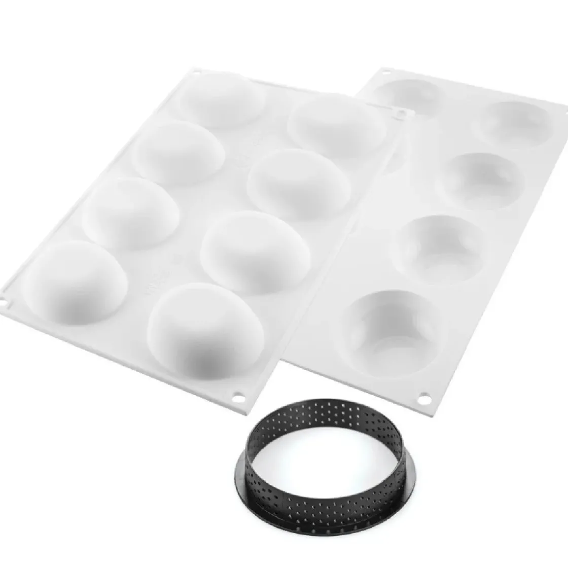De Silikomart Siliconenvorm & Taartring Set Palet Ø7cm is een set met 8 taartringen en een siliconenmal. De 8 ringen hebben een diameter van 7 centimeter, ideaal voor het maken van de bodem. De siliconenmal heeft een diameter van 6,4 centimeter, perfect voor het maken van mousses, bavarois of andere lekkernijen. Decoreer het met spiegelglazuur voor een prachtige afwerking!