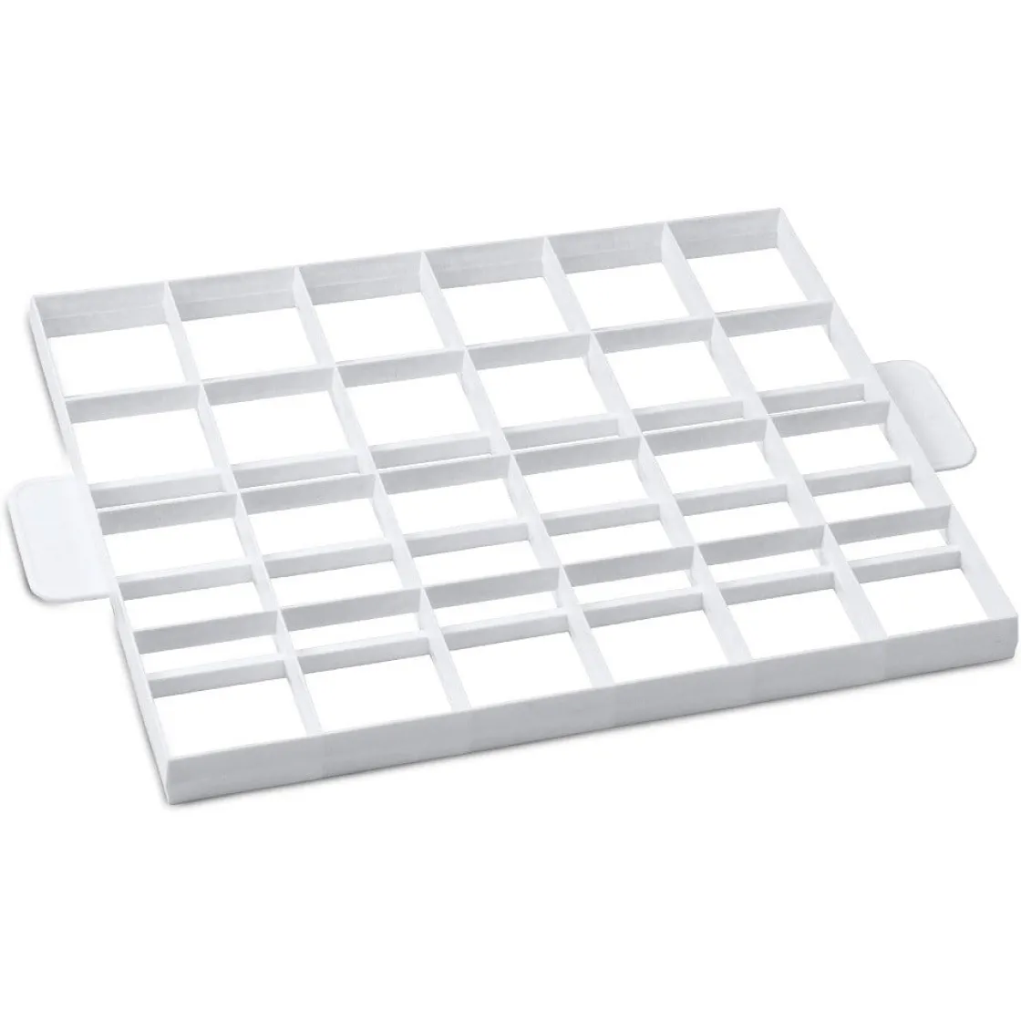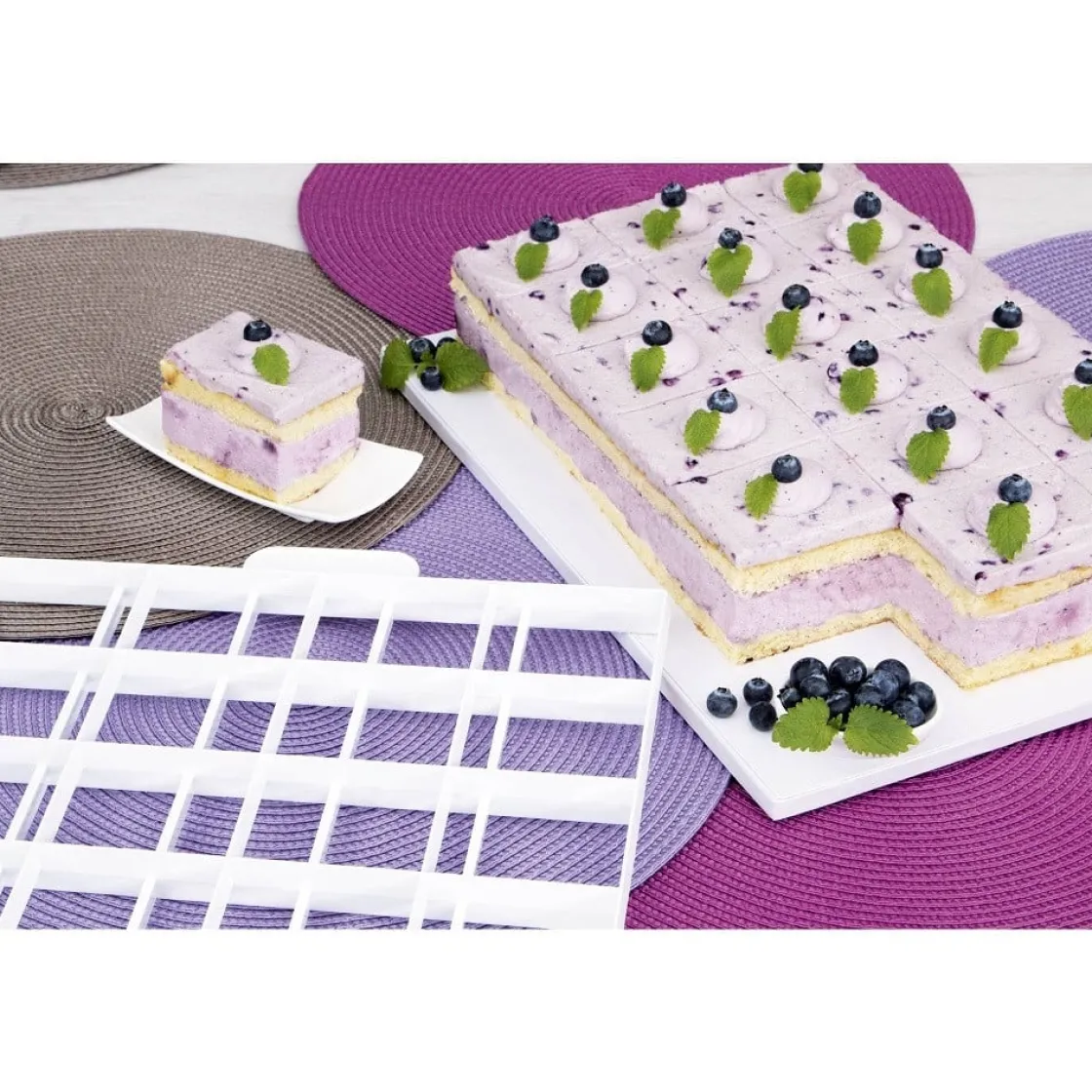 Zeer veelzijdige taartverdeler van Stadter. Deze taartverdeler is aan 2 kanten te gebruiken (24 of 30 gelijke vierkante stukken). Plaats de taartverdeler op de taart en gebruik het als markering om te weten hoe je moet snijden. Daarnaast is deze verdeler ook uitermate geschikt om deeg in gelijke stukken te verdelen. Gemaakt van voedselveilig kwaliteits-plastic en geschikt voor in de vaatwasser.