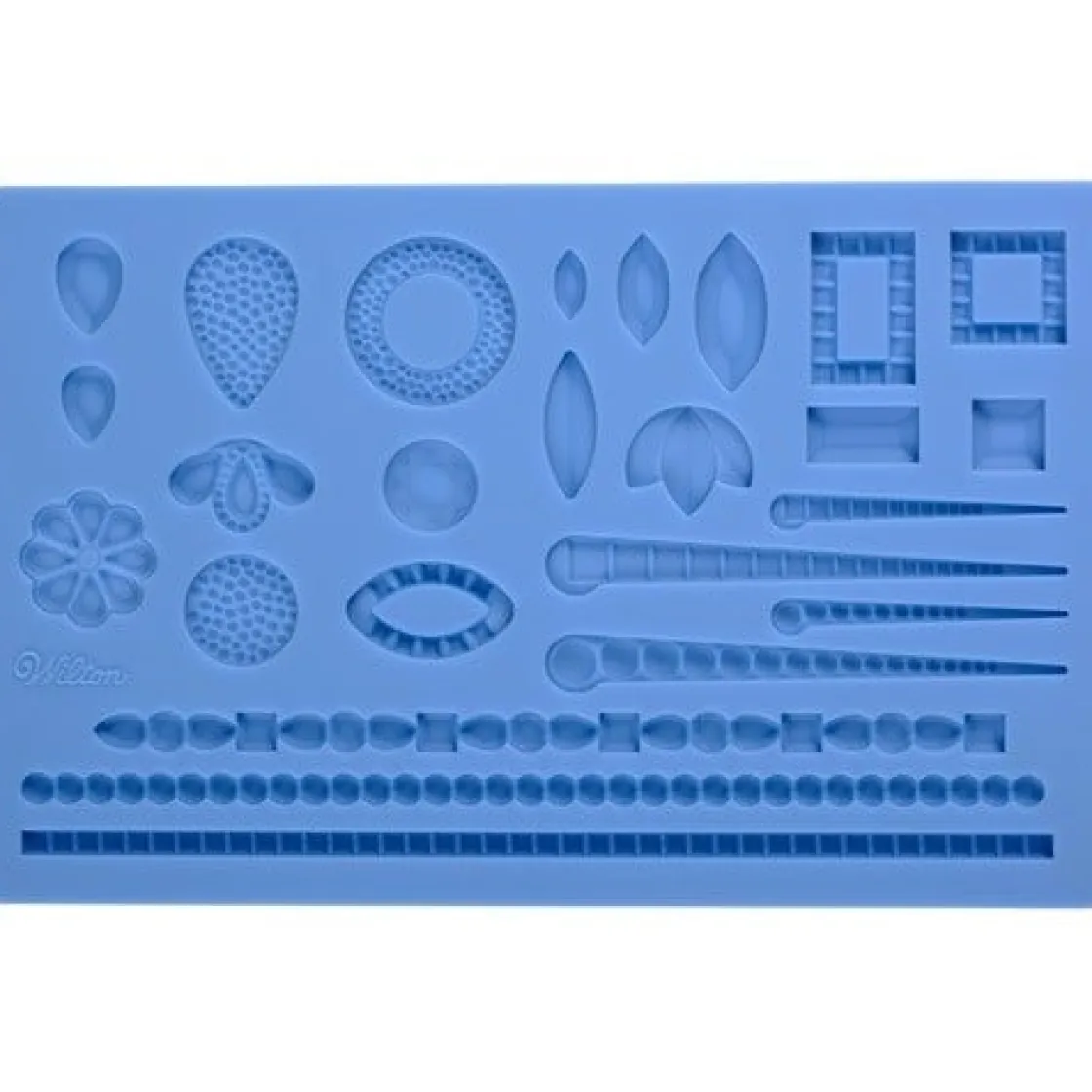 Eenvoudig en snel mooie decoraties maken? Dat gaat gemakkelijk met de flexibele Wilton Fondant & Gum Paste Mold Jewelry. Deze Wilton mal bevat diverse figuren. De mal is flexibel, zodat je de figuren gemakkelijk uit de mal kunt halen.