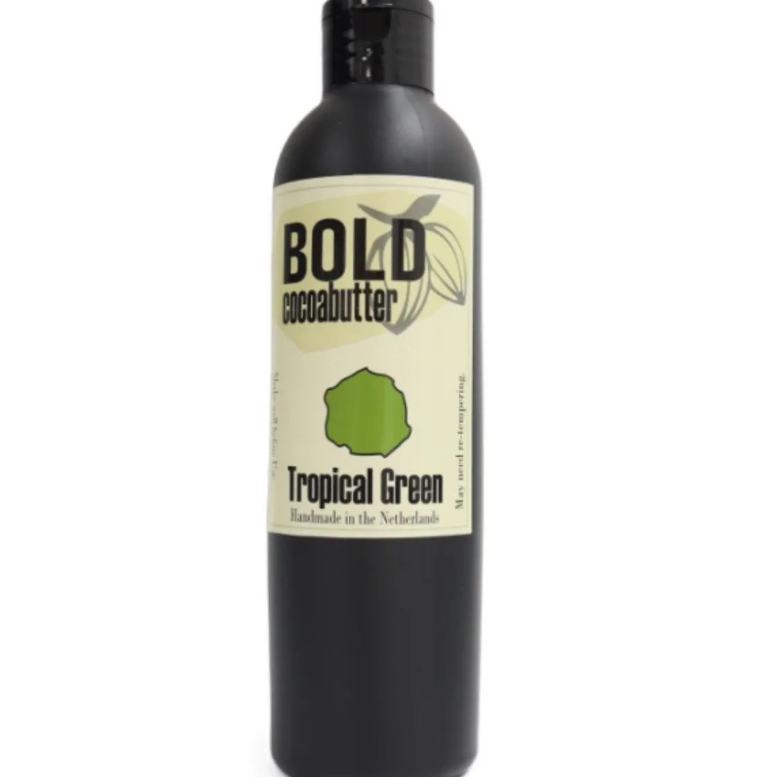 De Bold Cacaoboter Gekleurd Tropcial Green 230g heeft een warme donkergroene kleur, die je helemaal in tropisch sferen brengt. De kleur kan gebruikt worden om diverse soorten chocolade te kleuren. Deze kleur groen heeft een goede dekking, waardoor het kleurverschil nihil is. Dus of je nu ermee witte of donkere chocolade kleurt, de kleur groen blijft hetzelfde. Het flesje bevat 230 gram cacaoboter en is ook in verschillende andere kleuren verkrijgbaar.