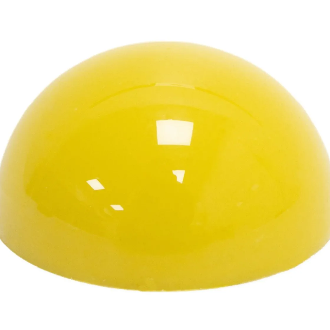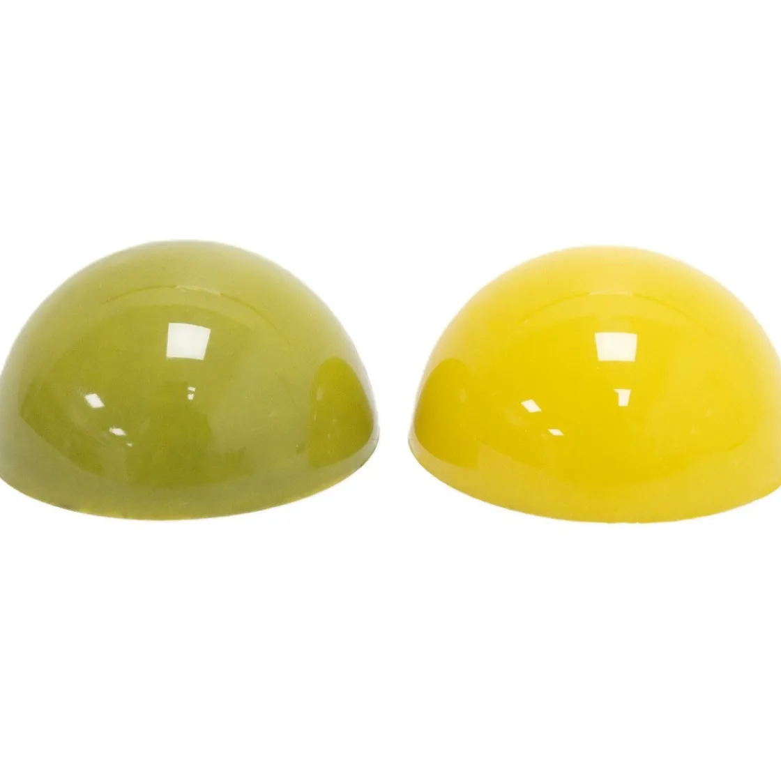 De Bold Cacaoboter Gekleurd Vintage 80g heeft een natuurlijk zachte gele kleur. De dekking is laag bij deze kleur, waardoor de kleur anders kan uitvallen bij verschillende soorten chocolade. Bij witte chocolade blijft de kleur geel, maar bij donkere chocolade verandert de kleur naar groen. Het verschil is goed te zien in de afbeelding met de 2 bonbons. De linker bonbon is gemaakt van donkere chocolade en de rechte bonbon van witte chocolade.
