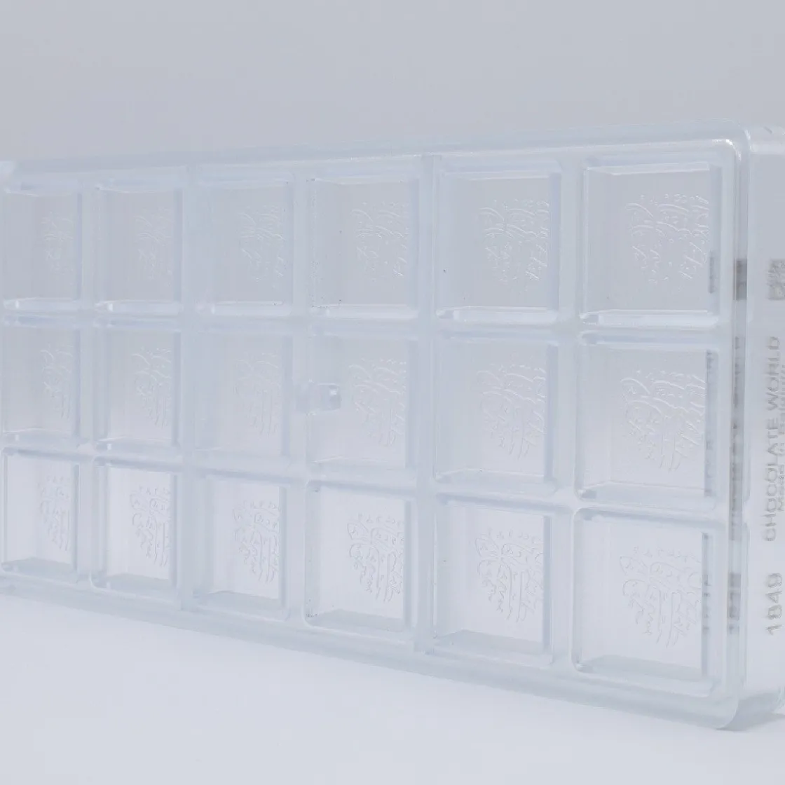 De Bonbonvorm Chocolate World Eid Mubarak (18x) 34x34x11,5mm is een prachtige bonbonvorm waarin je verfijnde en feestelijke bonbons kunt creëren. Deze chocolademal bevat 18 holtes, deze holtes zijn vierkant en hebben een Eid Mubarak opdruk. Elke bonbon heeft een grootte van 3,4 bij 3,4 centimeter en een hoogte van circa 1,1 centimeter.