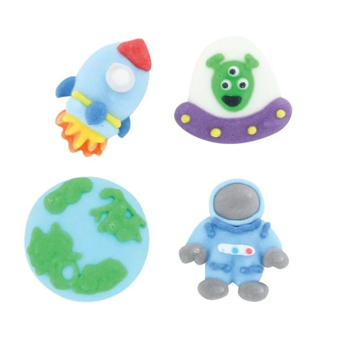Mooie suikerdecoraties voor het versieren van taarten, (cup)cakes of muffins. Deze suikerdecoraties hebben een ruimte thema en bevat een wereldbol, ruimteschip, ruimtevaarder en een alien. Leuk in combinatie met cupcake cups in een ruimte thema (artikelnummer CAI521).