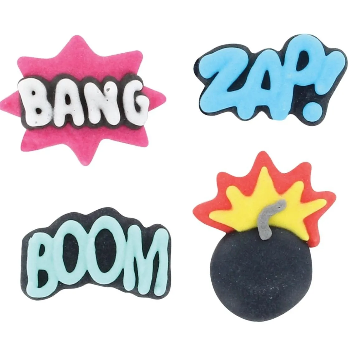 Deze gave suikerdecoraties zijn ideaal voor het versieren van taarten, (cup)cakes en muffins. Gebruik deze bijvoorbeeld voor een feestjes met als thema stripboek. De suikerdecoraties zijn in de vorm van een exploderende bom en de teksten BOOM, BANG en ZAP!
