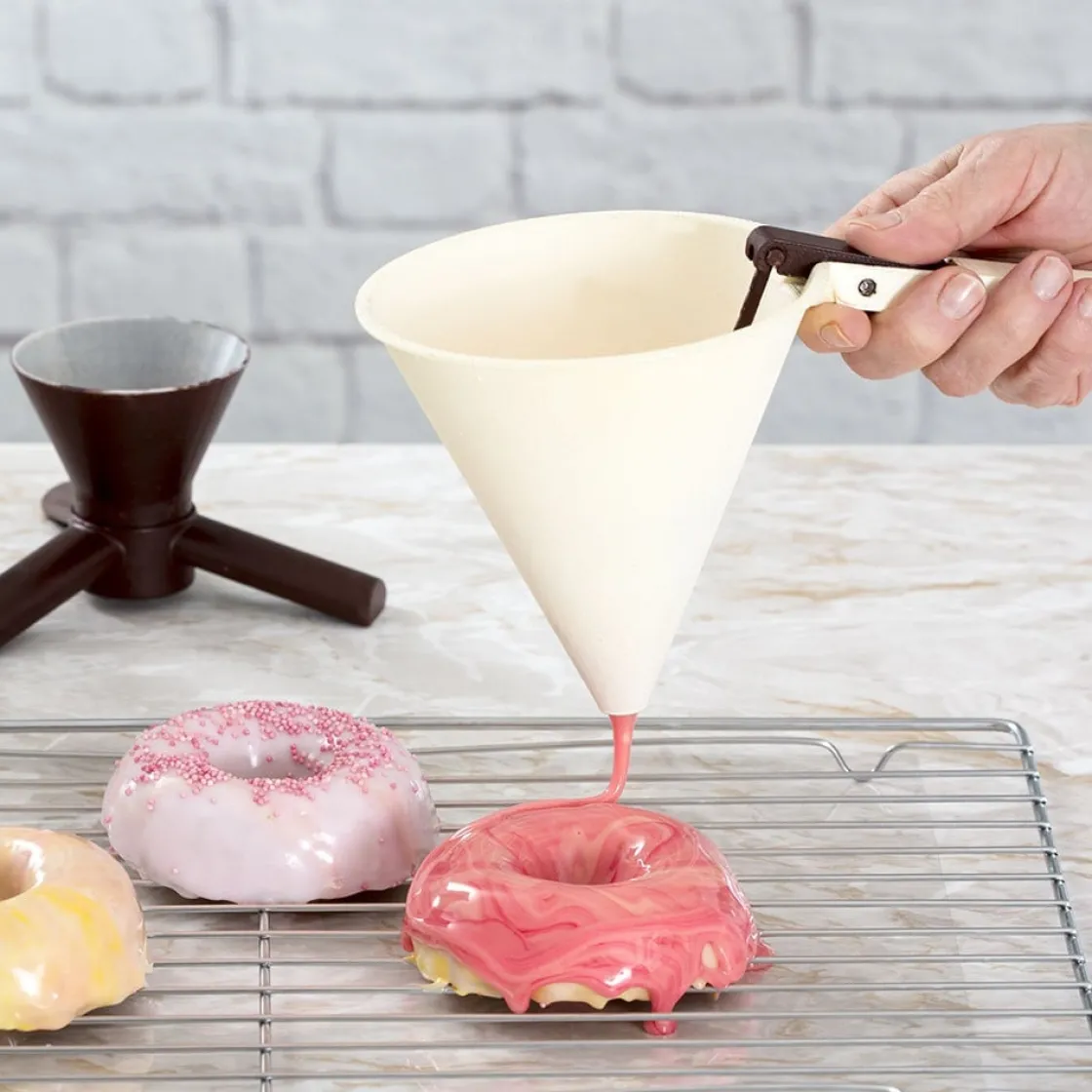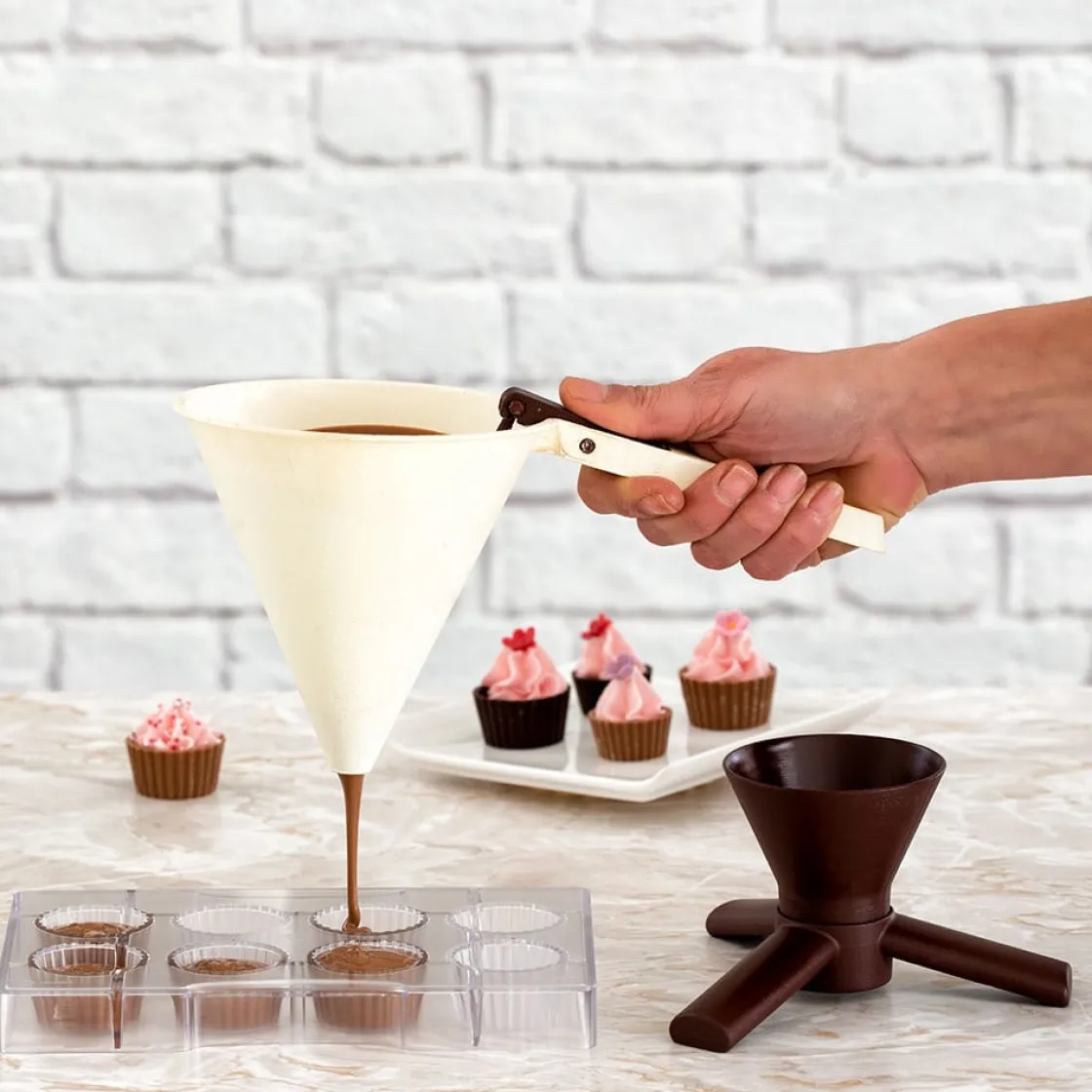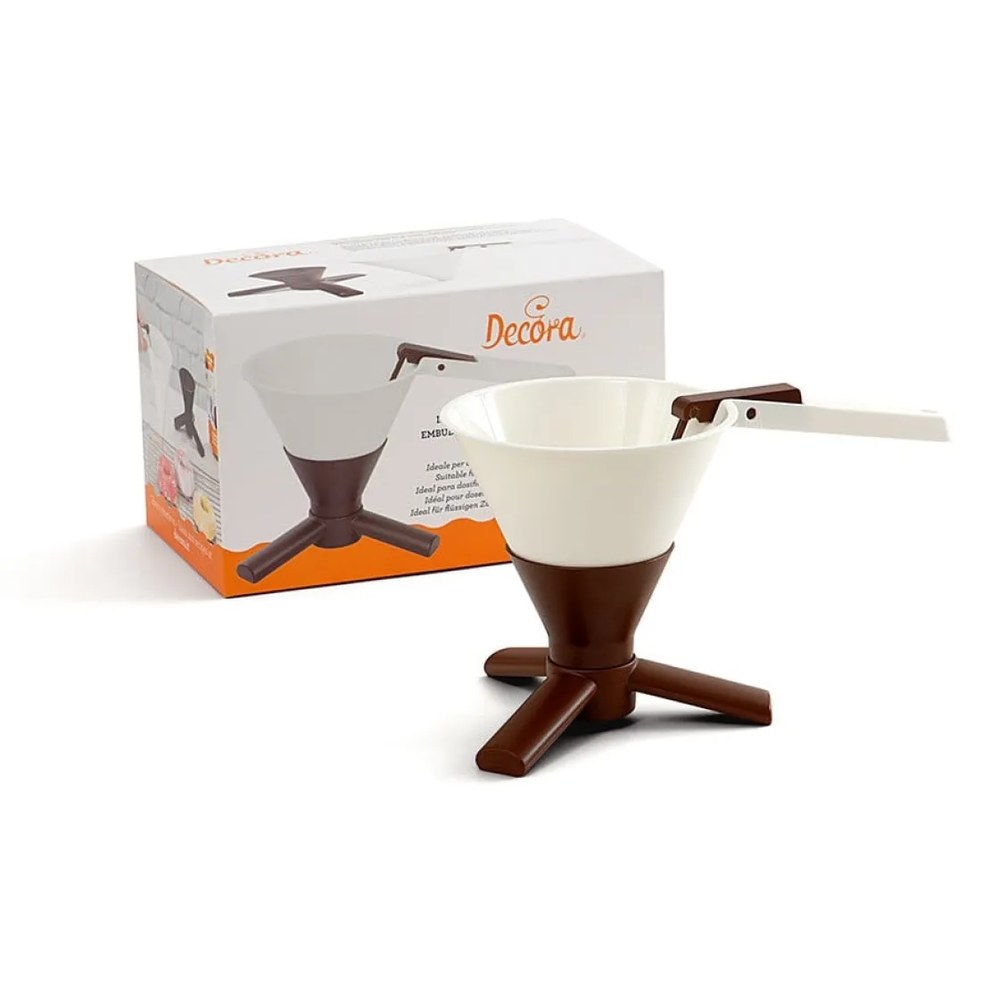 Kunststof doseertrechter met voet van het merk Decora. Perfect geschikt voor chocolade, jellies, vloeibaar ijs, etc. Met de knop kun je envoudig zien hoeveel bereiding er nog in de trechter zit. Doseren was nog nooit zo makkelijk!