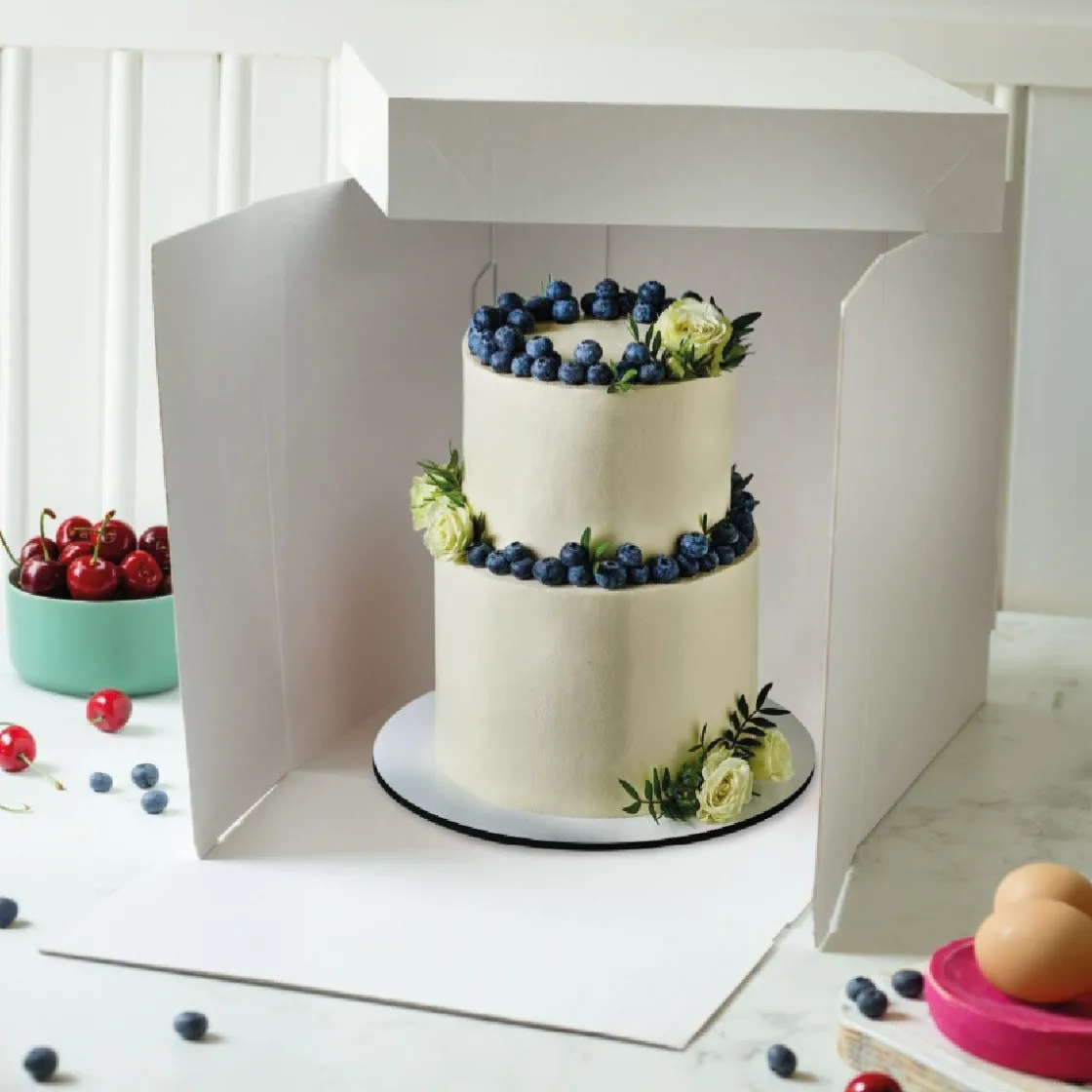 Deze Taartdoos 40,5×60,5×28,5cm heeft een grote rechthoekige vorm. Geschikt om een grote taart in te vervoeren of te bewaren. De doos wordt geleverd inclusief deksel. Zowel de taartdoos als de deksel kunnen makkelijk in elkaar gevouwen worden. De doos heeft een soort ‘haken’, waardoor de zijkanten stevig in elkaar blijven staan. Bovendien bevat de doos een vernieuwend openingssysteem. De voorkant valt open, wanneer er geen deksel op zit. Hierdoor kun je gemakkelijk een taart erin zetten of eruit halen.