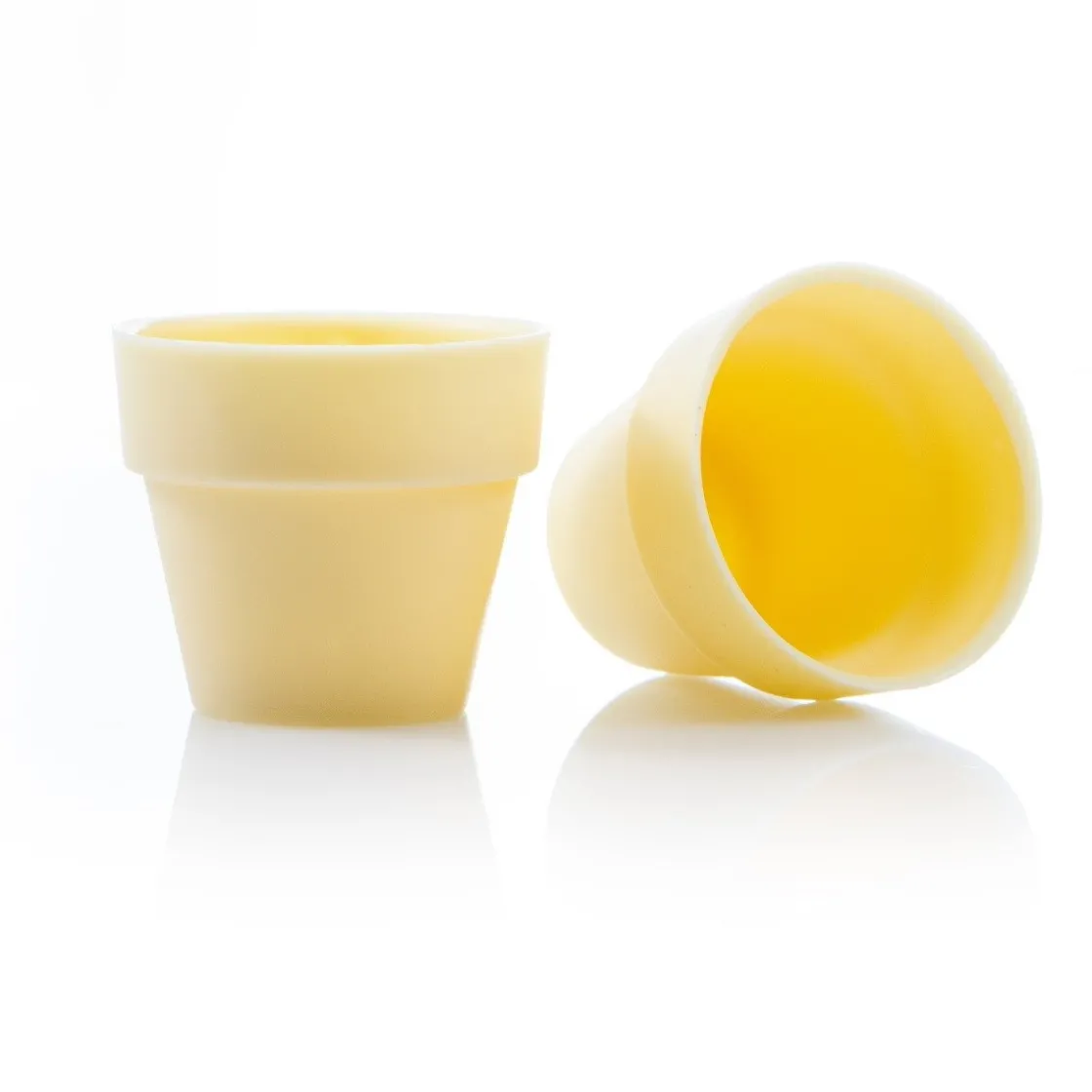 Mooie witte chocolade bloempotjes die gebruikt kunnen worden ter decoratie voor baksels of gevuld kunnen worden. In meerdere kleuren verkrijgbaar.