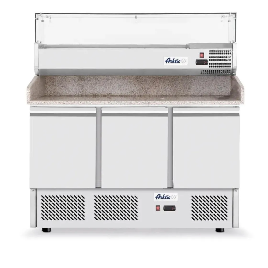 Deze uitvoering is vervaardigd uit hoogwaardig roestvast staal, met granieten werkblad. De deuren zijn voorzien van comfortabele handgrepen. Geforceerde luchtkoeling met automatische ontdooiing, compressor onder de koelruimte. Uitermate geschikt om te gebruiken bij GN bakken tot 1/1. Digitaal display en elektronische thermostaat. Met 4 verstelbare kunststof antislipvoetjes. Klimaatklasse: SN-T. Koelmiddel: R600a. Alle modellen worden geleverd zonder GN-bakken.