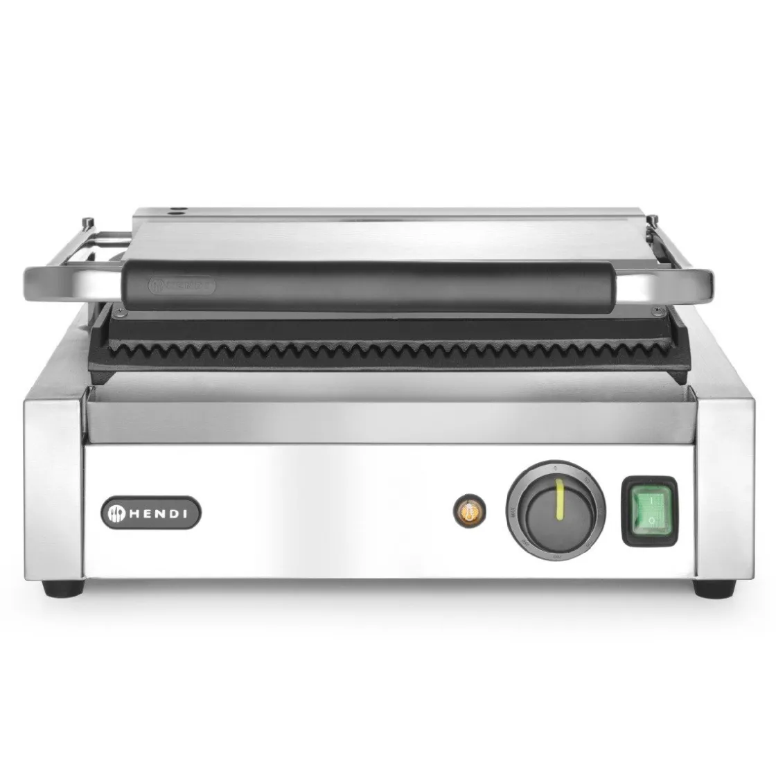 De Hendi Contactgrill Panini heeft boven en onder een geheel geribde plaat. De platen zijn gemaakt van gietijzer dat geëmailleerd is. Met deze contactgrill kun je perfect brood, vlees en groenten te grillen. Het verwarmen gebeurt door middel van krachtige verwarmingselementen, die verwarmen tot 300 graden. Met de thermostaat aan de voorkant stel je de juiste temperatuur in. Er wordt een borstel meegeleverd, waarmee het apparaat eenvoudig te reinigen is. De voorkant van de grill bevat een uitneembare opvangbak die makkelijk te reinigen is.