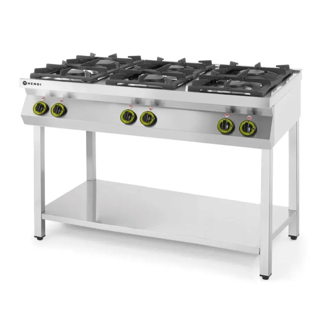 Het HENDI Gasfornuis 6-pits open standaard is een zware uitvoering gaskookplaat die geschikt is voor pannen tot ø 300 mm. Deze beschikt over drie branders van 3,5 kW en drie krachtige branders van 6,5 kW. Het frame is aan 1 kant open en biedt veel opbergruimte.