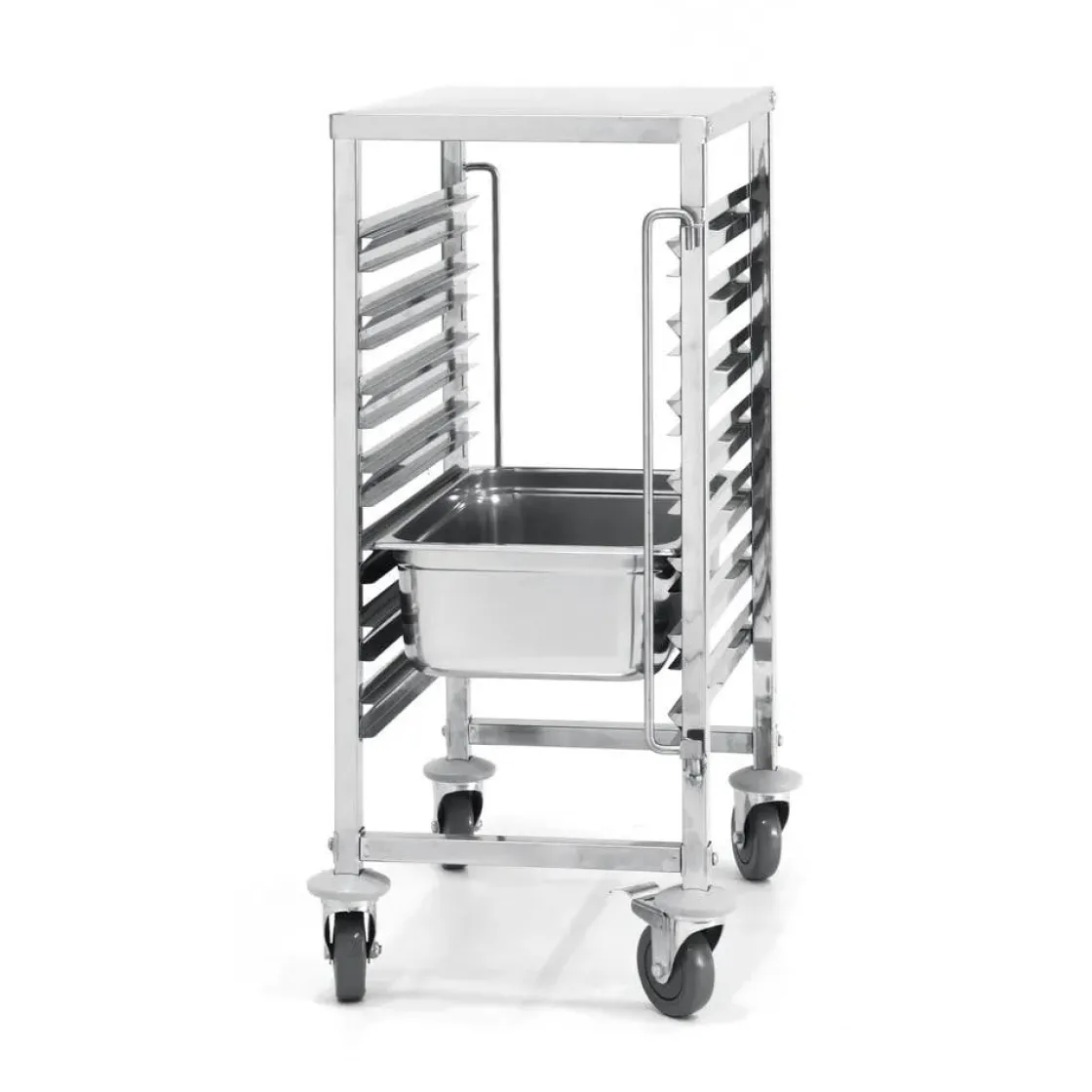 Dankzij het doordachte ontwerp is dit apparaat uitermate geschikt voor Ontworpen voor GN 1/1 dienbladen/bakken – tussenruimte 80 mm. Met werkoppervlak. Aan beide zijden een vergrendeling voor de plateau’s Voorzien van 4 zwenkwielen waarvan 2 geremd. GN 1/1 – 530×325. Flatpack levering.
