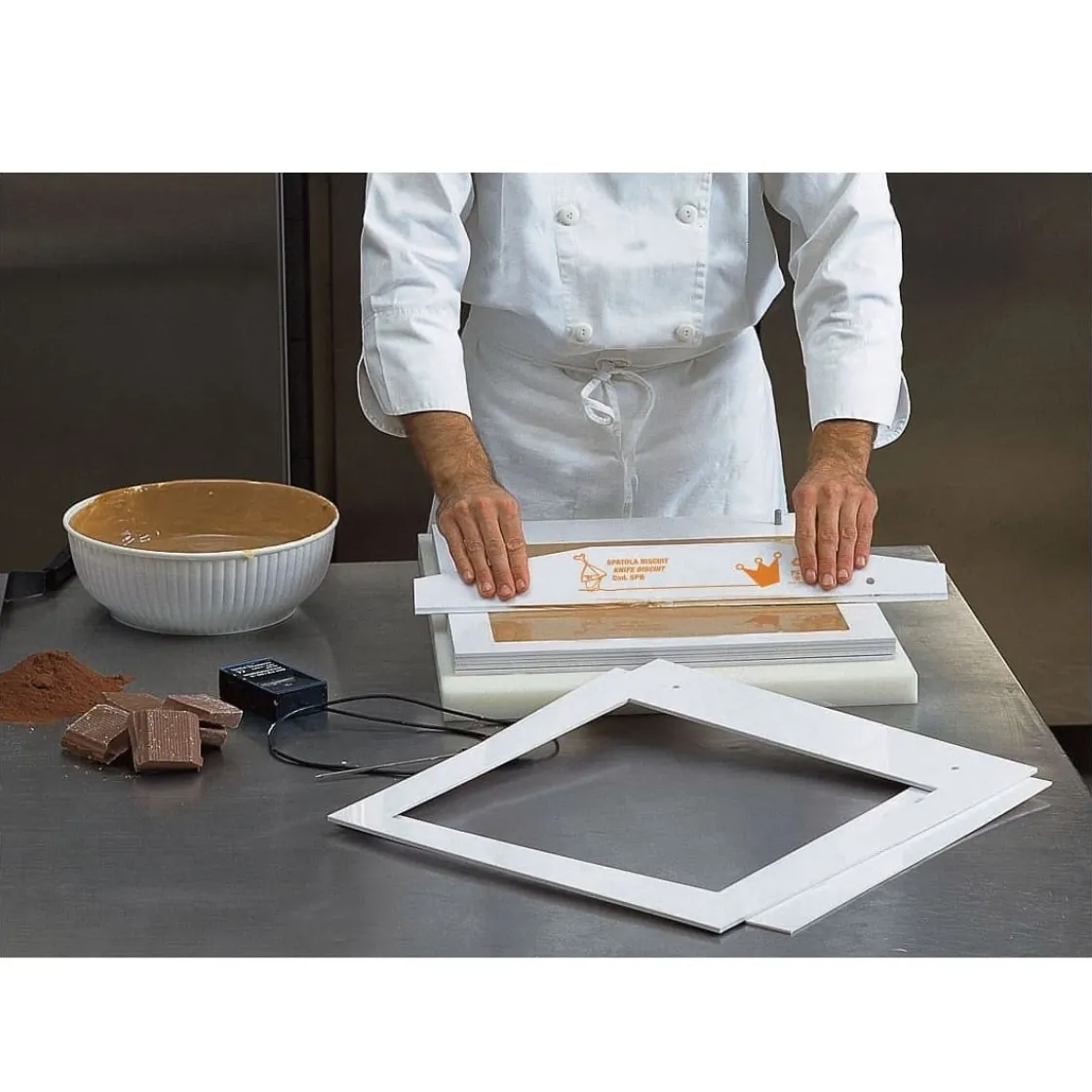 Frame / Sjabloon van het merk Martellato om handmatig dunne kapsel-/biscuitplakken mee te ’trekken’ door middel van een krabber. Met dit frame krijg je een exacte biscuitplak van 57x37cm met een dikte van 5 mm.