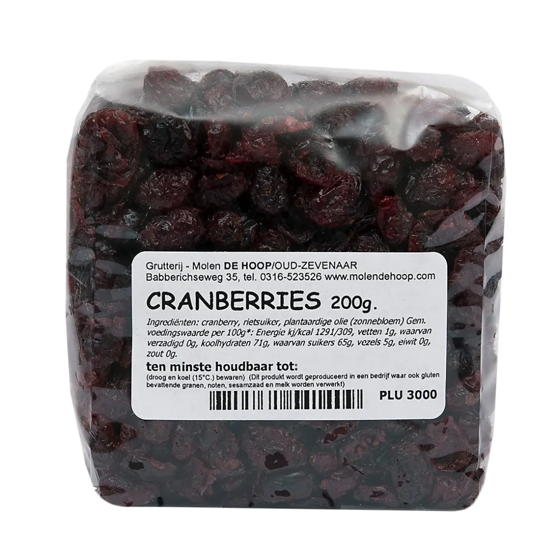 Een cranberry, ook wel grote veenbes genoemd, is een bes die aan een kruipende of overhangende plant met dunne stengels groeit. De Molen de Hoop Cranberry’s zijn gedroogd en daarbij is er wat olie en rietsuiker toegevoegd, wat een resultaat geeft met een heerlijke zoete smaak. Je kunt deze cranberry’s gebruiken ter decoratie of door het beslag van bijvoorbeeld: haverkoeken, diverse cake soorten, broden, maar je kunt ze ook verwerken door hartige gerechten.