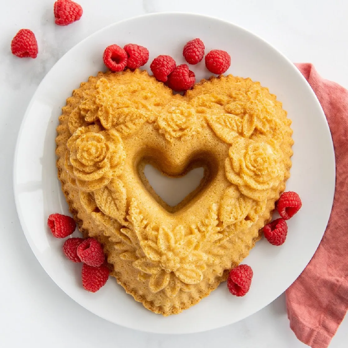 De Nordic Ware Floral Heart Tulband Bakvorm is een prachtige bakvorm in de vorm van een hart met mooie, fleurige versieringen erop.
