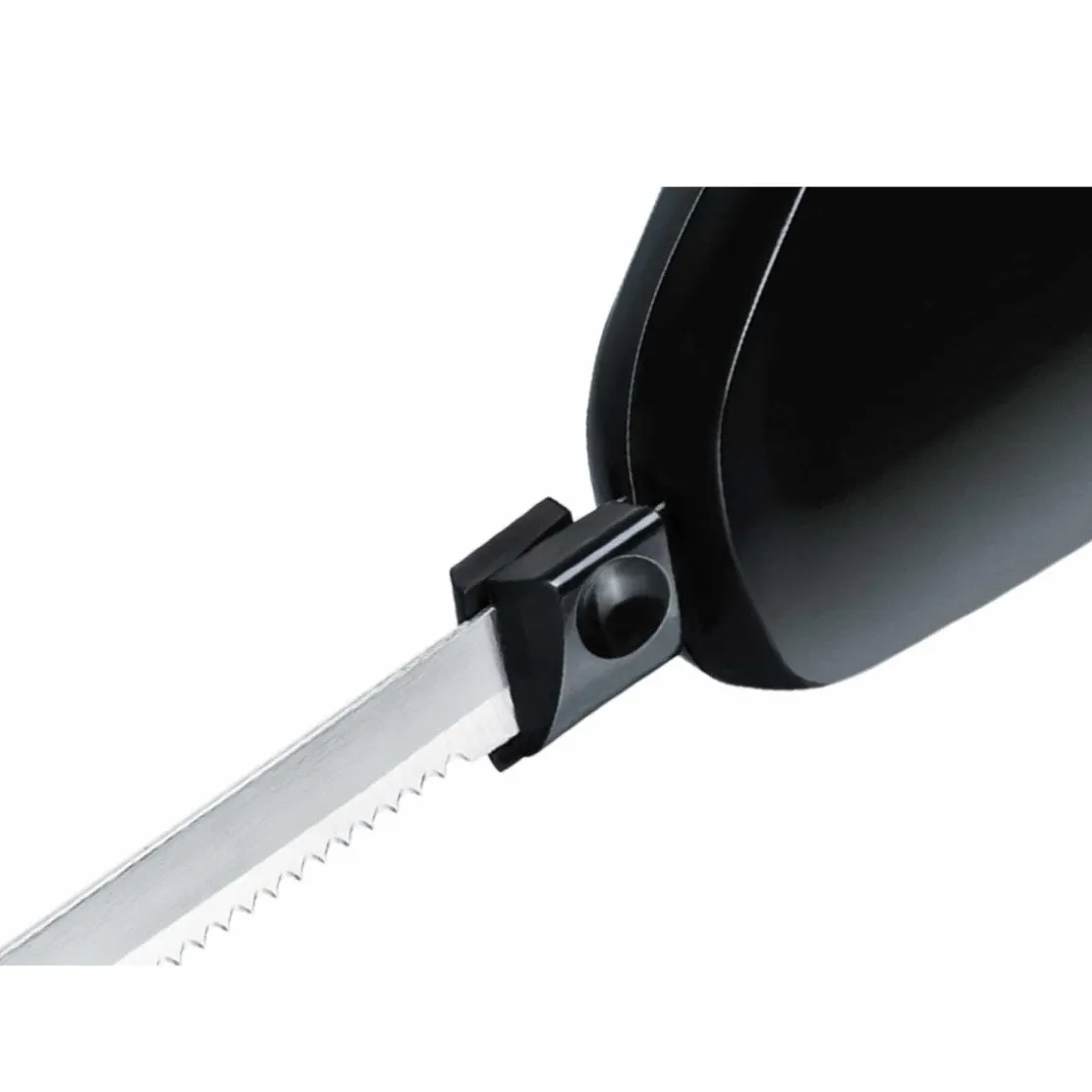Het Rommelsbacher Elektrisch Mes is een handige tool voor in de keuken. Met dit mes gaat het snijden van voedsel snel en gemakkelijk en is er geen inspanning voor nodig. De krachtige motor is trilvrij en kan zelfs bevroren producten aan. Het mes kan bijvoorbeeld gebruikt worden om brood, taart, vlees of pizza te snijden. In de verpakking zitten twee soorten messen: een mes met fijne tanden en een mes met grove tanden. Beide messen zijn inclusief vingerbescherming.