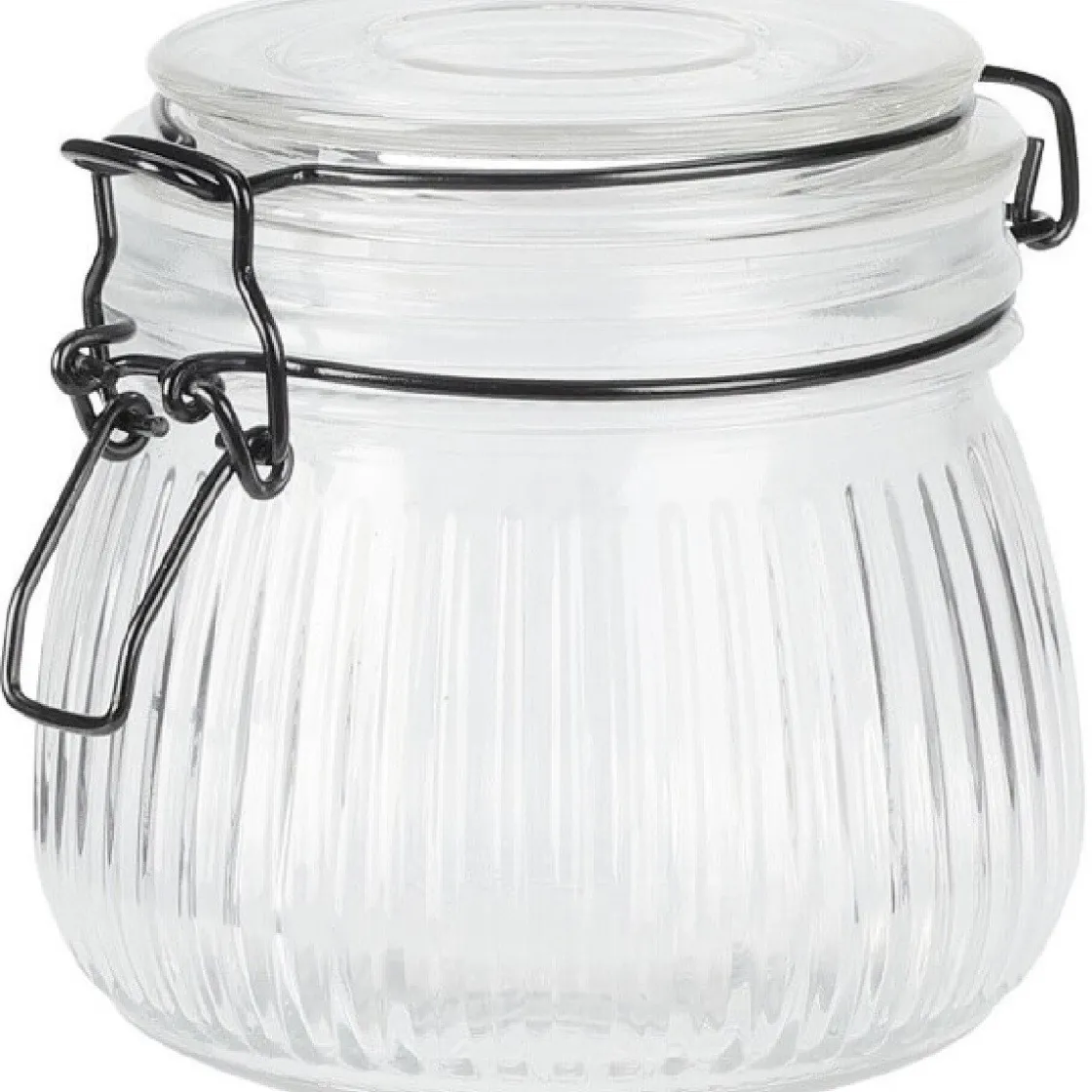 De glazen opslagpot heeft glas dat bewerkt is met strepen. Verder heeft de weckpot een inhoud van 500 mililiter.