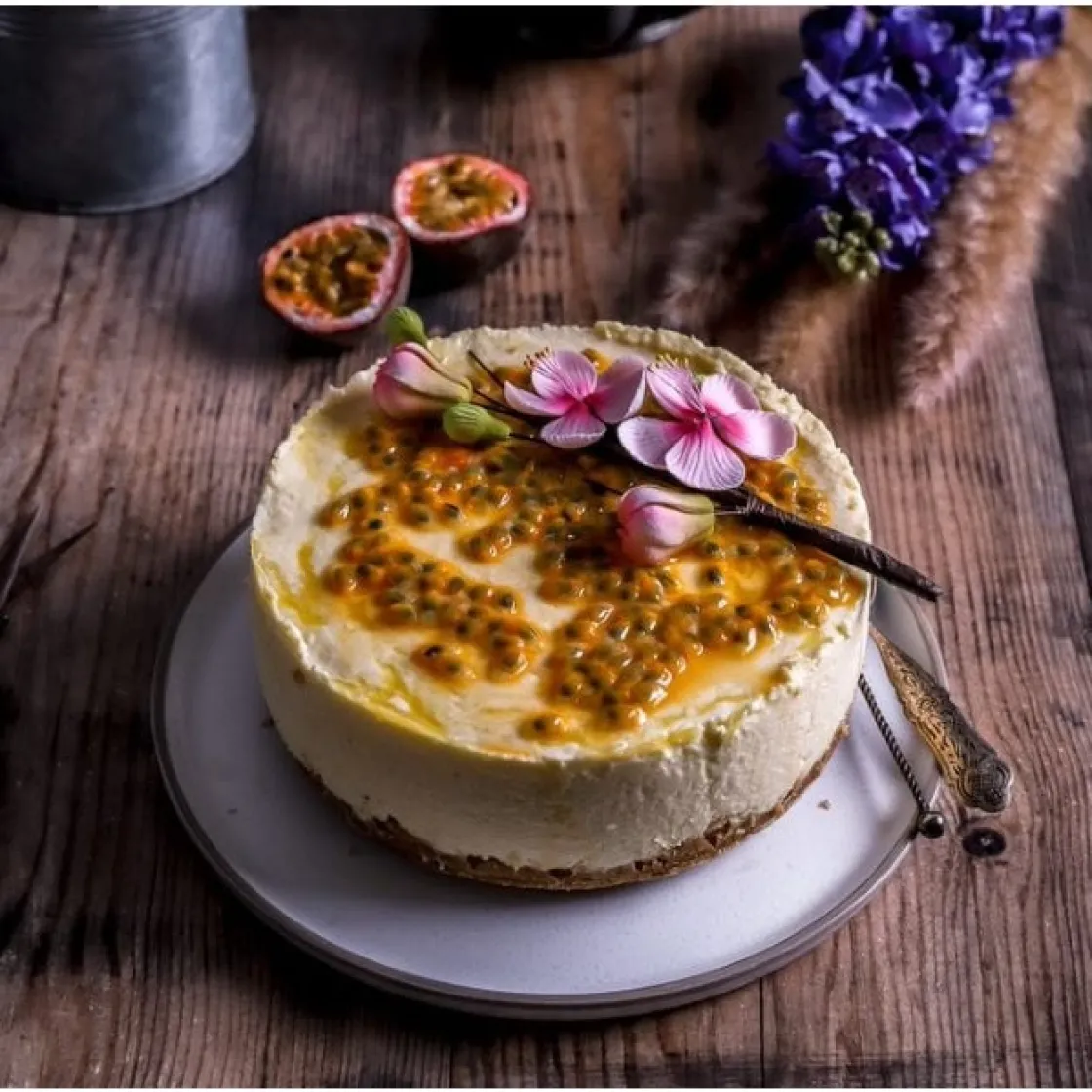 Op de twee afbeelding staat een foto van een heerlijke Mango Cheesecake. Wil je weten hoe je deze kunt maken? Bekijk dan het recept op onze blog.