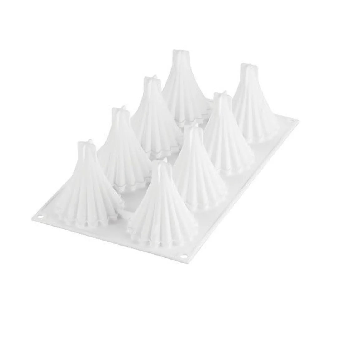 Laat al je creativiteit los op deze Astro95 vorm van Silikomart. Gregory Doyen heeft samen met Silikomart deze prachtige mold op de markt gebracht om de bakker/kok een duwtje in de rug te geven om eigen creativiteit te gaan gebruiken. De stijl en het ontwerp van de lijnen maken het een veelzijdige vorm. De vorm geeft een driedimensionaal en elegant effect aan de producten in de etalage maar ook aan een gevuld dessert voor op een bord. De mal is gemaakt van acht holtes met elk een inhoud van 95 ml die gevuld kunnen worden met verschillende producten.