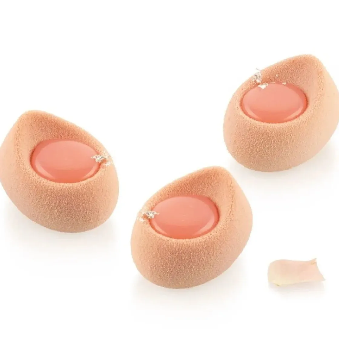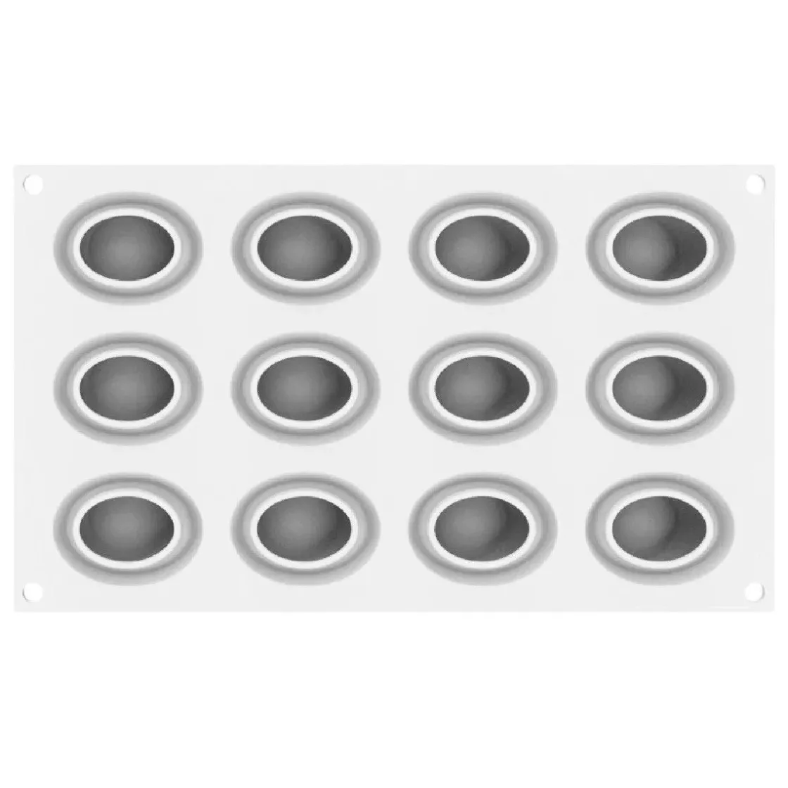 De Silikomart Siliconen Vorm Nebula (12) 5,1×3,7×3,2cm heeft een ovale vorm en een moderne uitstraling. Met de vorm kun je de mooiste gebakjes en desserts creëren. Prachtig om mousse of parfaits in te bereiden.