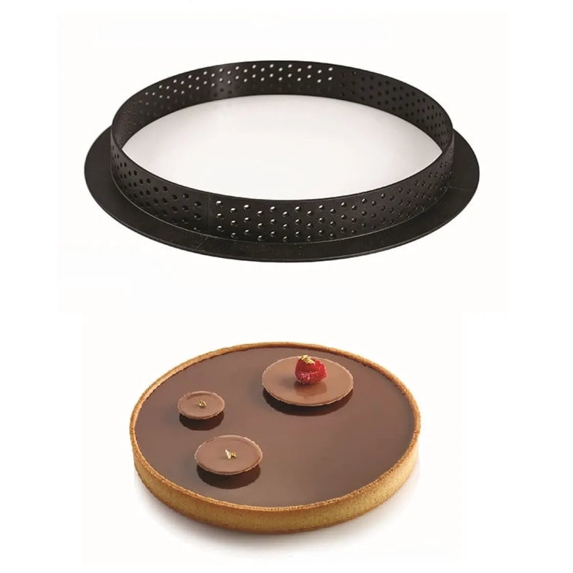 Deze geperforeerde taartring van Silikomart heeft diameter van 8 cm. De ring is gemaakt van het hoogwaardige materiaal exoglas dat zeer geschikt is om mee te bakken. Door de perforatie kan tijdens het bakken de waterdamp nog beter uit het deeg verdampen voor een croquant resultaat. De taartjes die je hiermee maakt hebben een doorsnede van 19 cm. De ringen zijn antikleef en roestvrij en hebben een hoge thermische stabiliteit. Kortom je maakt een perfecte ronde taart met deze vorm die je vervolgens helemaal naar eigen wens kunt decoreren.