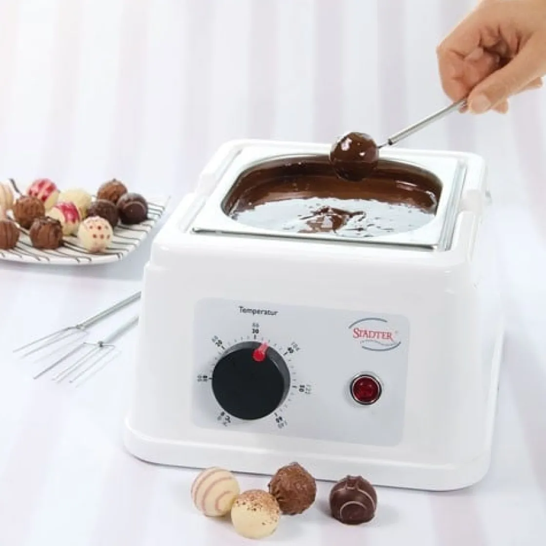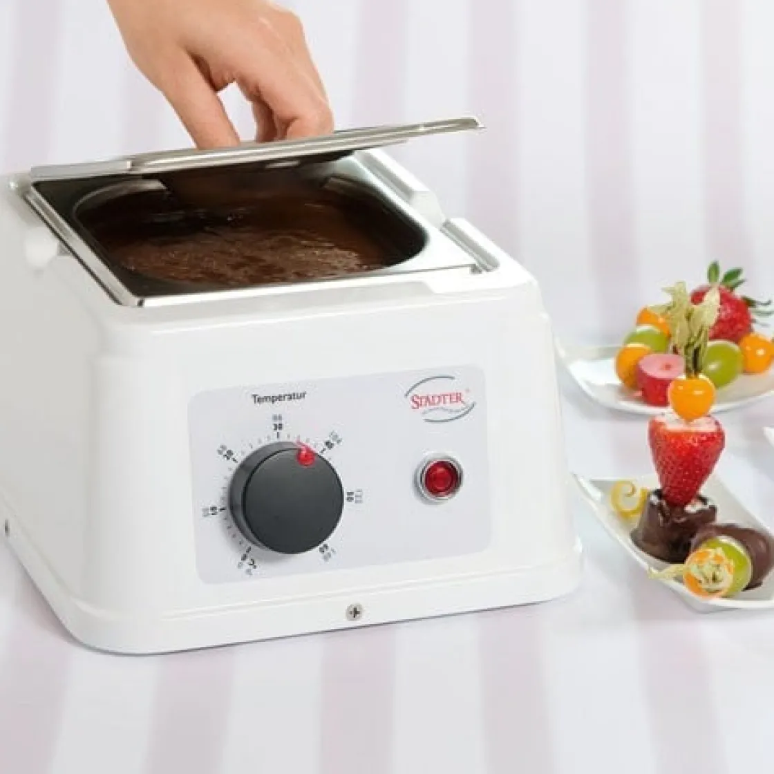 Een smeltbak is vooral bedoeld om chocolade tijdens- of vóór verwerking op de juiste temperatuur te houden.