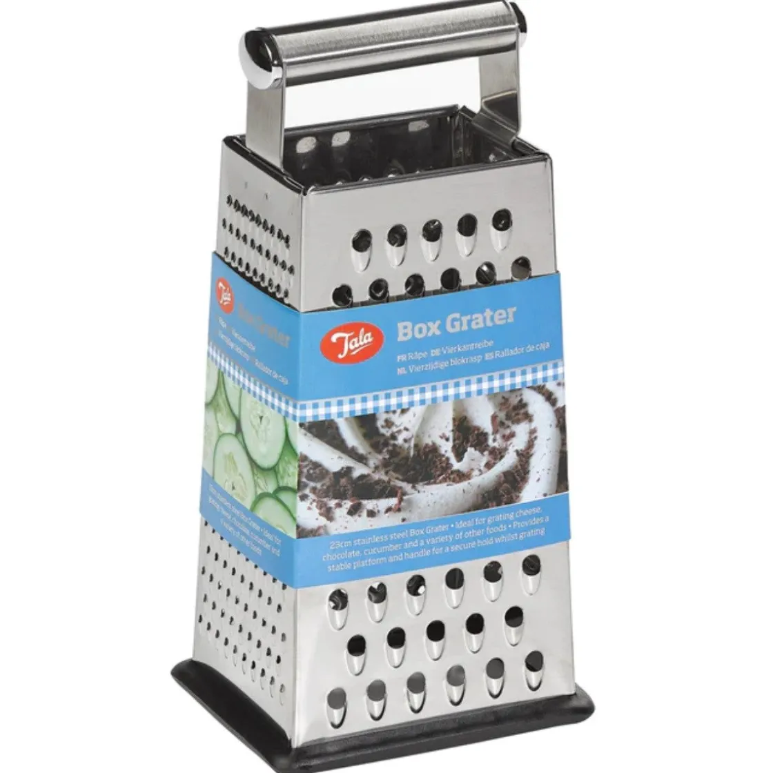 De Tala Blokrasp Vierzijdig RVS 23cm is een veelzijdige rasp. De rasp heeft vier verschillende kanten, waarmee je voedingsmiddelen van grof tot fijn kunt raspen. Dit handige product is gemaakt van roestvrijstaal en is erg stabiel door het antislip rubber aan de onderkant. Ideaal te gebruiken om bijvoorbeeld kaas, chocolade of komkommer te raspen. Het product is vaatwasserbestendig.