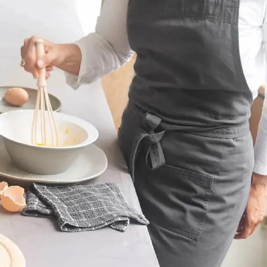 De breedte van dit schort is 75 centimeter en de lengte 90 centimeter. Natuurlijk is het grijze schort ook voorzien van een ceintuur, die je zelf op de juiste maat kunt knopen.