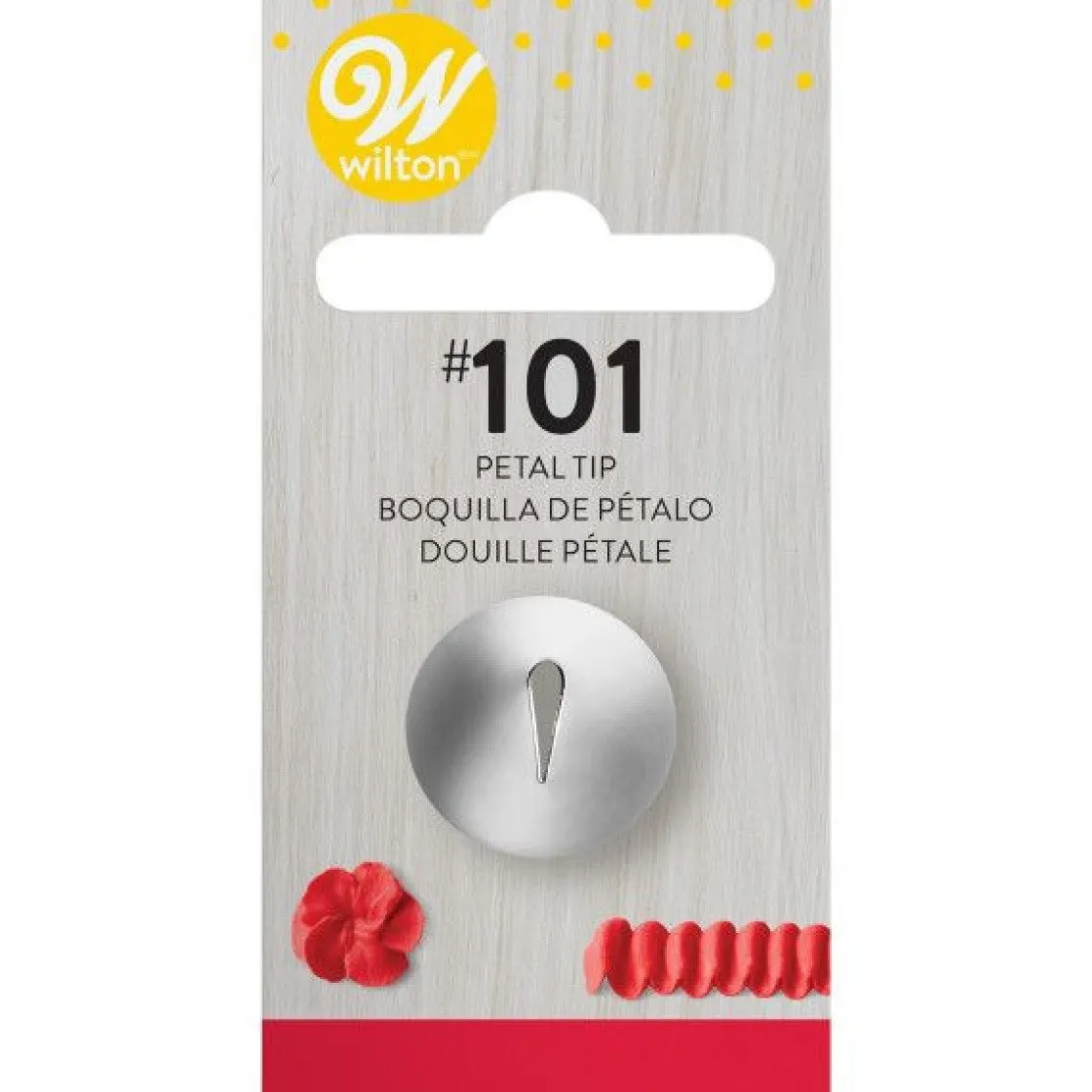 Het Wilton Spuitmondje #101 is gemaakt van roestvrij staal en heeft een gladde, langwerpige druppelvormige opening. Hiermee creëer je prachtige decoraties. Ideaal voor het maken van bloemblaadjes, maar ook geschikt voor ruches, strikjes en allerlei andere figuren.