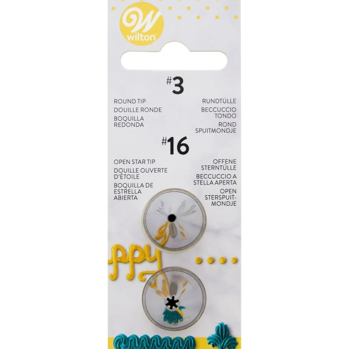 Set van 2 metalen spuitmondjes van het merk Wilton te gebruiken bij het maken van dunne lijntjes, puntjes, balletjes, pareltjes en fijn kant en voor het maken van sterretjes, dropflowers en gekartelde randjes. De set bestaat uit de spuitmondjes: #003 & #016.